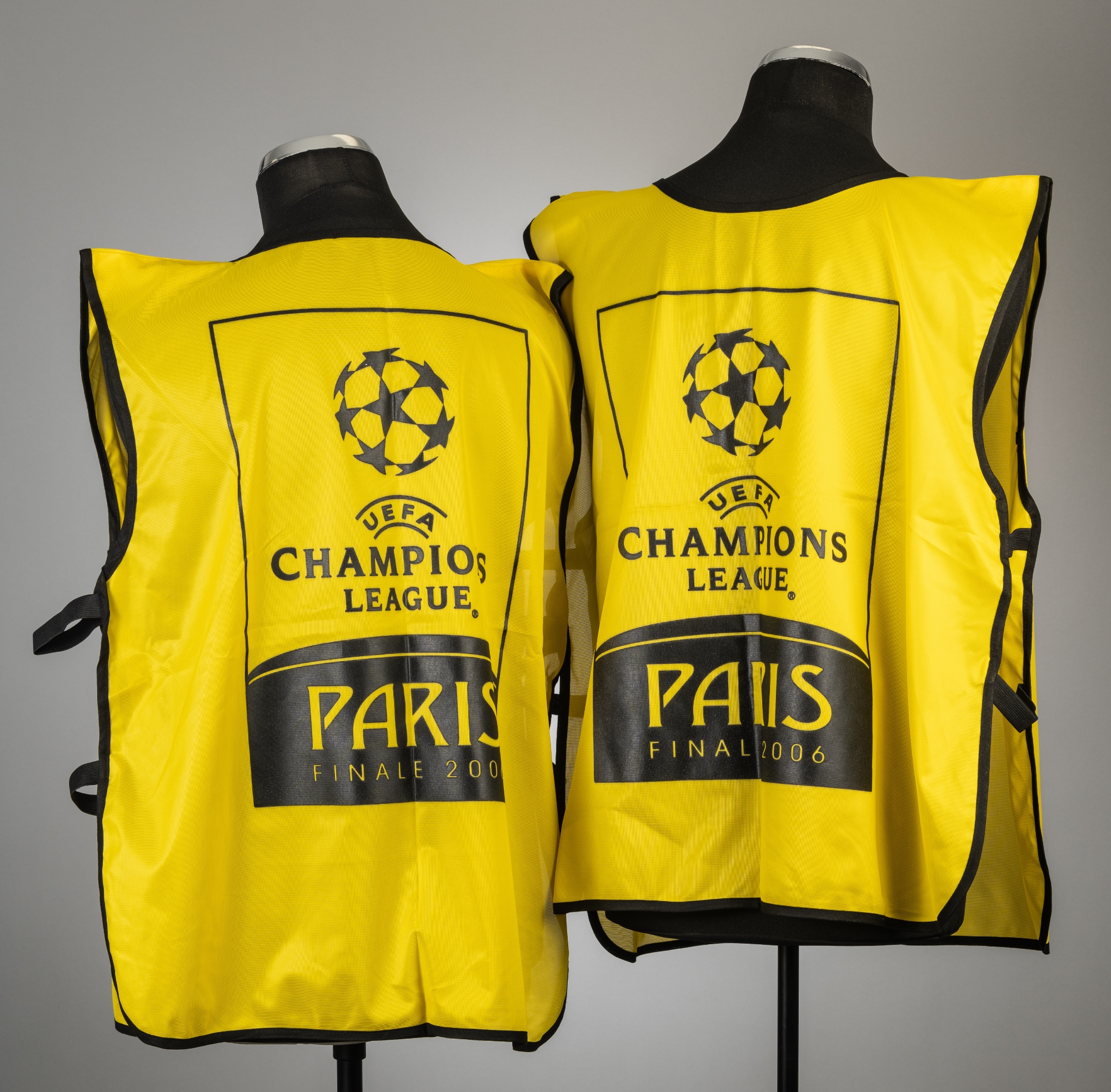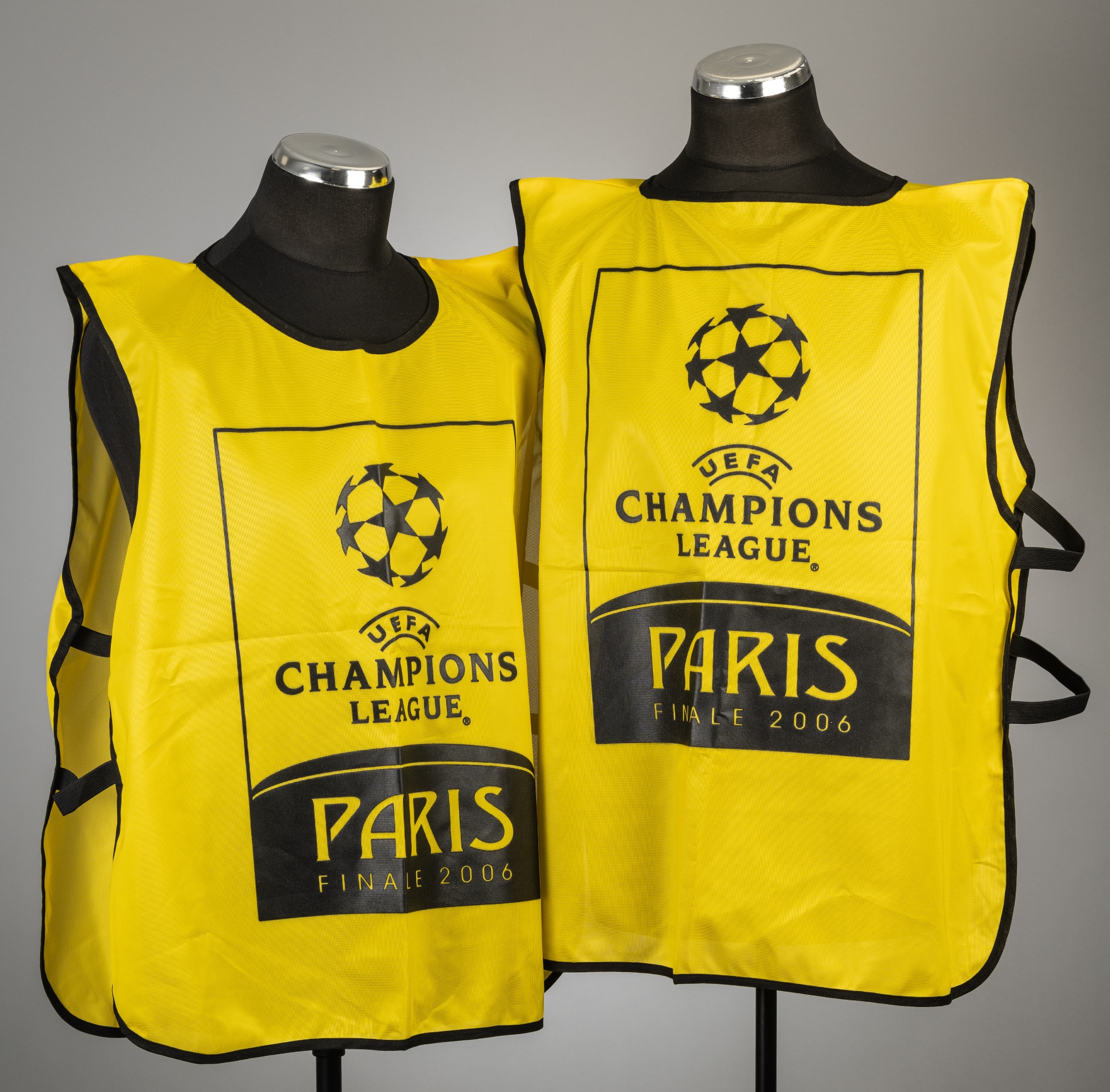 Two 2006 UEFA Champions League Final official yellow warm-up tabards from Arsenal v Barcelona at Stade de France, Paris, 17th May, each with black binding, printed with UEFA STARBALL CHAMPIONS LEAGUE PARIS FINALE 2006 on each side, with elasticated side-bands, good condition, (2) Barcelona beat Arsenal 2-1, with goals by Eto'o and Belletti for Barcelona and a single goal by Campbell for Arsenal.