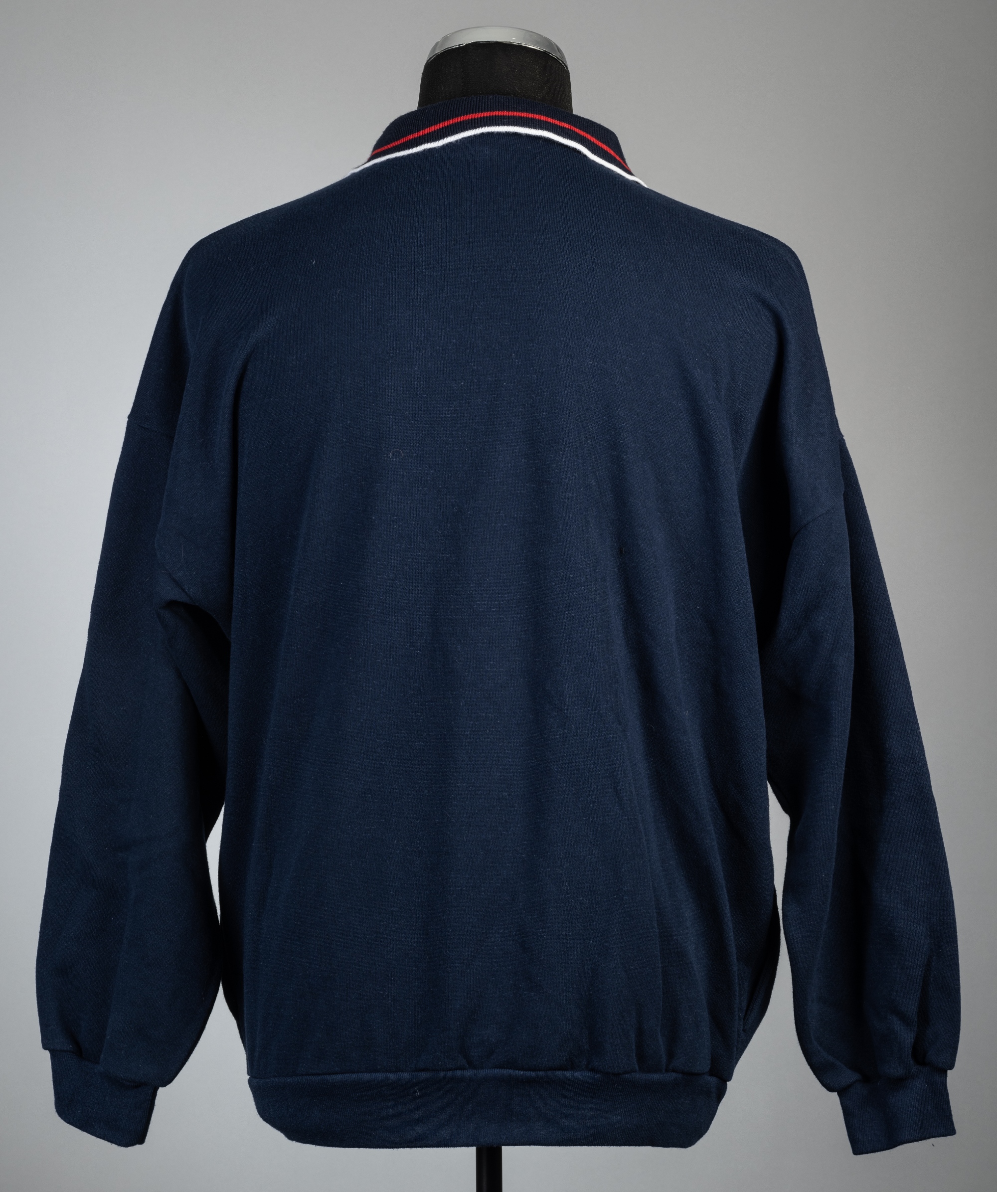 England navy player travel sweatshirt, circa 1985, Umbro, long-sleeved with printed England three lion emblem on front, size Large