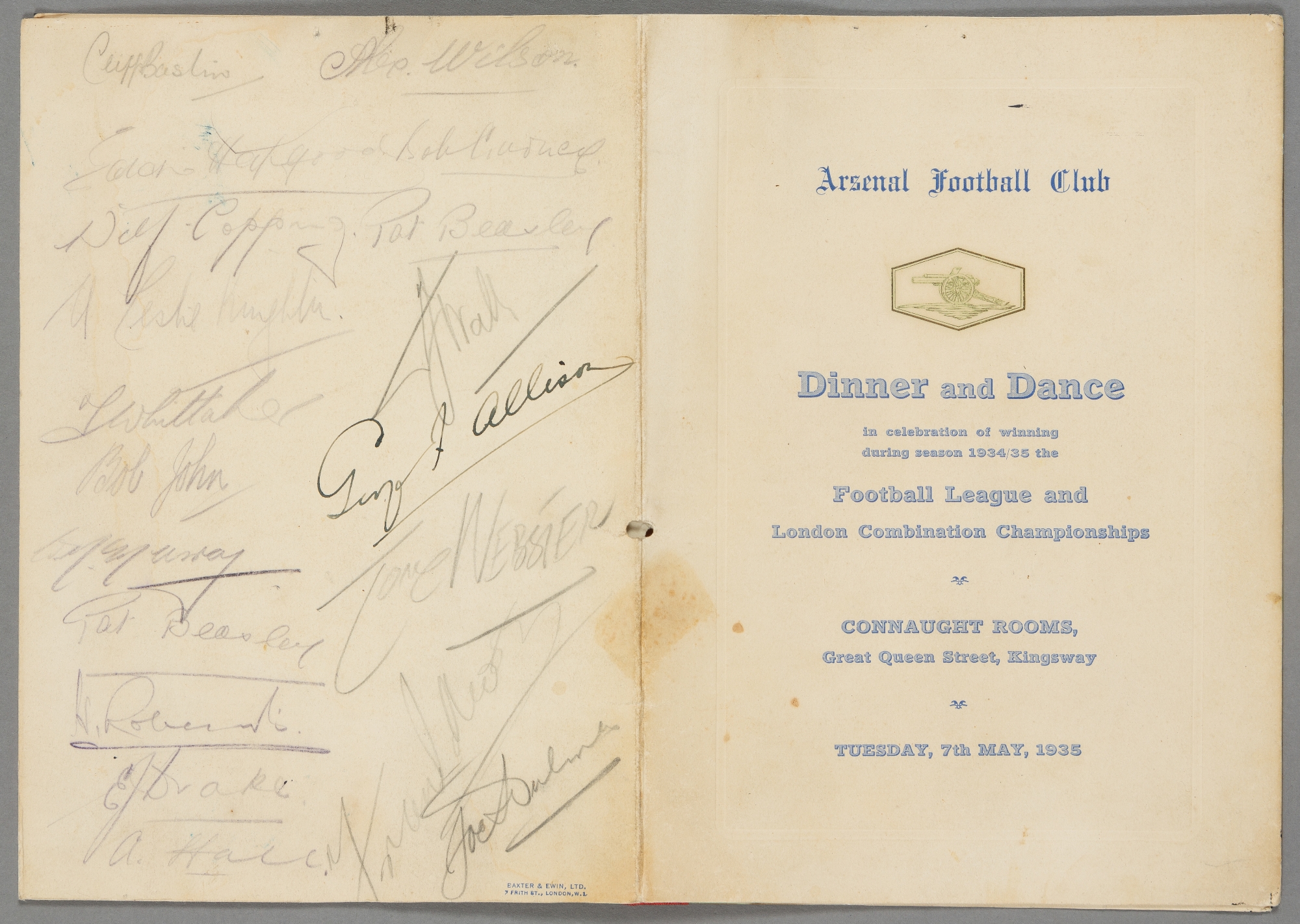 Signed Arsenal FC Dinner and Dance menu celebrating the 1934-35 Football League Championship season, held at the Connaught Rooms, London, 7th May 1935, the back page signed in ink by George Allison who guided the team to their 3rd consecutive title in his first full season after the passing of Herbert Chapman, the remaining signatures in pencil and including Bastin, Hapgood, Copping, Knighton (former manager), Whittaker (trainer), John, Beasley (signed twice), Roberts, Drake, Hale, Wilson, Wall (Director), Webster (cartoonist), Moss and Hulme and one other unidentified
