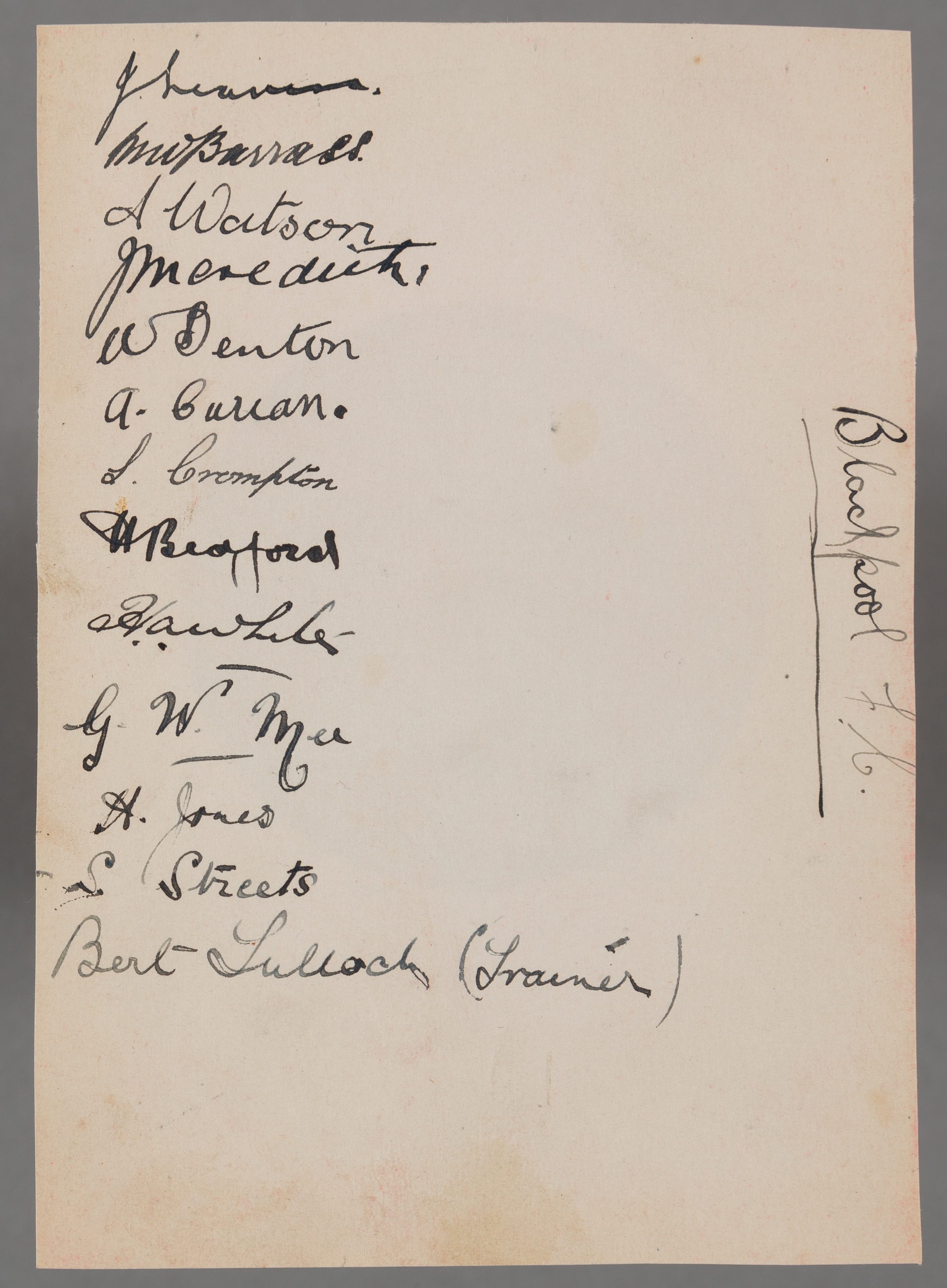 BLACKPOOL F.C 1923-24 LEAGUE DIVISION 2 FOOTBALL AUTOGRAPH TEAM SHEET, The 1923-24 season was Blackpool’s 23rd season (twentieth consecutive) in the Football League. They competed in the 22-team Division Two, then the second tier of English football, finishing fourth. The team first began wearing tangerine for this season, after a recommendation from referee Albert Hargreaves, who officiated a Holland v Belgium international match and was impressed by the Dutchmen's colours. Harry Bedford was the club's top scorer for the third consecutive season, with 33 goals in all competitions (32 in the league and one in the FA Cup). Bert Tulloch retired this season, after ten years of service for Blackpool, his only professional club. VINTAGE AUTOGRAPH ALBUM PAGE SIZE 6 ¼” x 4 ¼” BEARING THE ORIGINAL AUTOGRAPHS OF 13 MEMBERS OF THE BLACKPOOL F.C 1923-24 FOOTBALL SQUAD, 13 ORIGINAL INK SIGNATURES INCLUDING: HARRY BEDFORD, BARRASS, CURRAN, WATSON, MEREDITH, CROMPTON, MEE, JONES, STREETS, BERT TULLOCH (trainer) et al. VERY GOOD CONDITION.