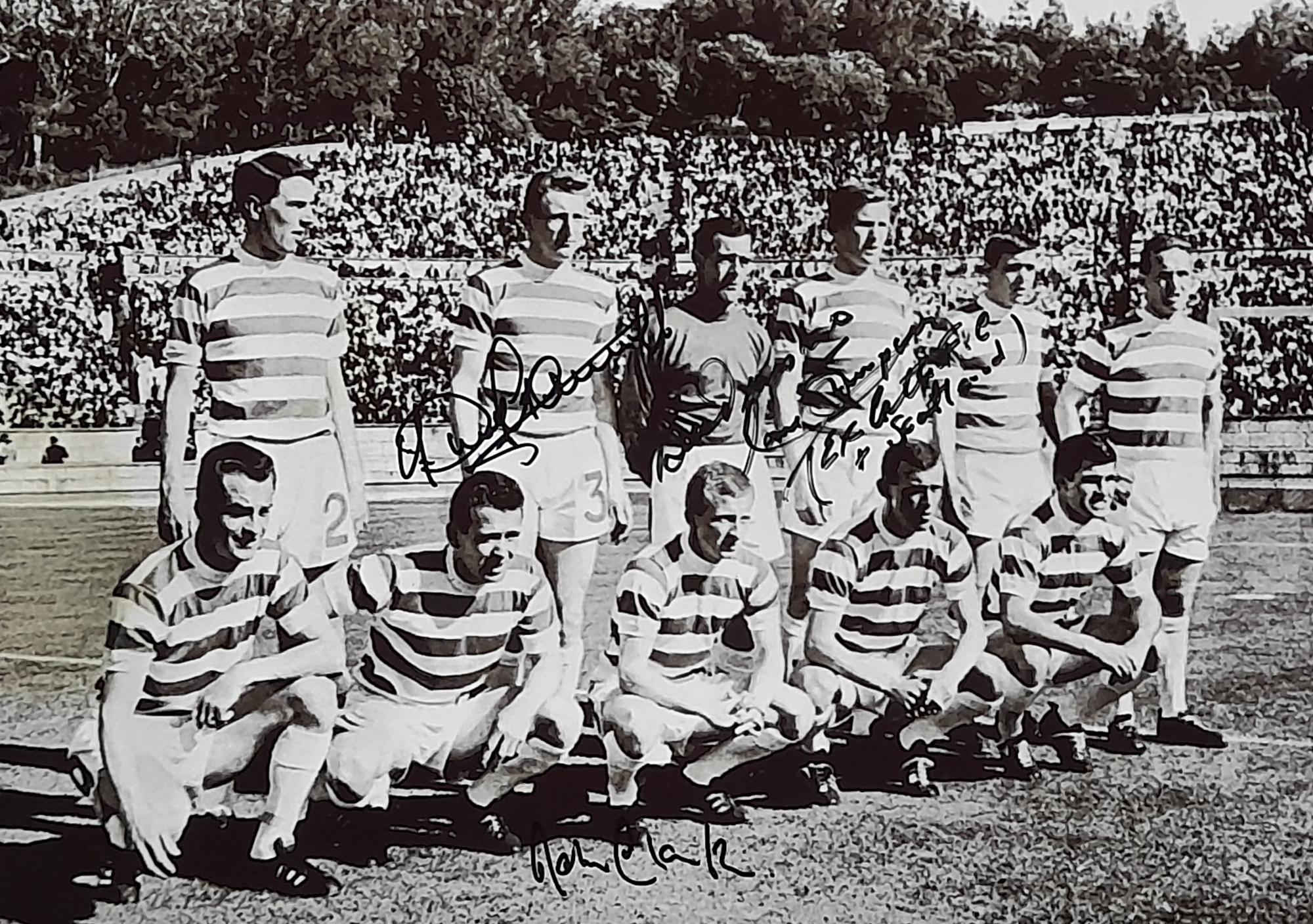 Celtic 1967 Lisbon Lions signed photo, shows the team photo prior to ko in the European Cup Final versus Inter Milan, autographed by Tommy Gemmell, John Clark and the very rare signature of goalkeeper Ronnie Simpson with the inscription “Best Wishes” and “ex Celtic + Scotland”, measuring 30.5 by 20cm., comes with COA