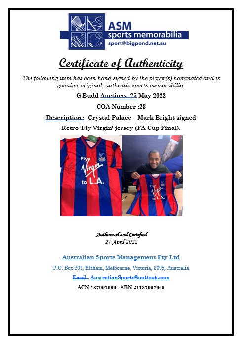 Mark Bright signed red and blue Crystal Palace retro home jersey, Score Draw, short-sleeved with club crest and sponsor logo, signed in marker pen on front, with retail tag and COA and photo proof