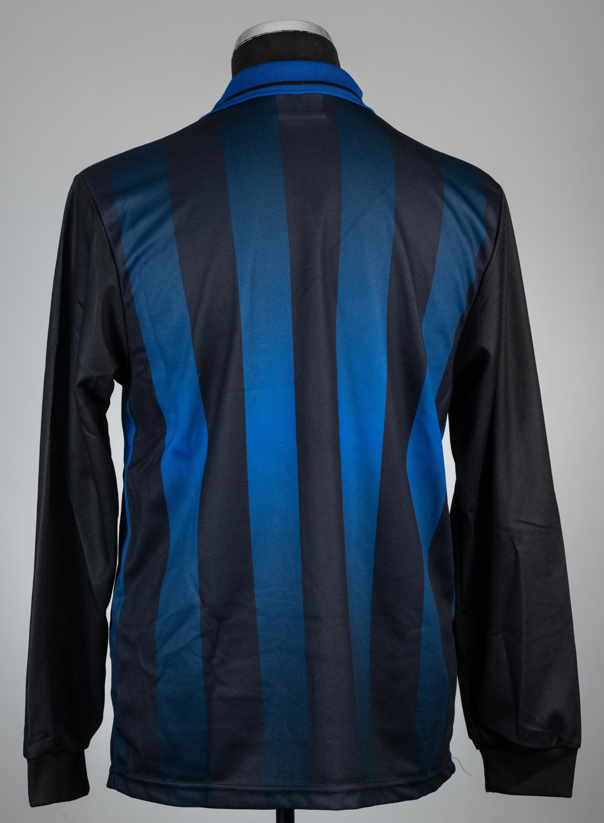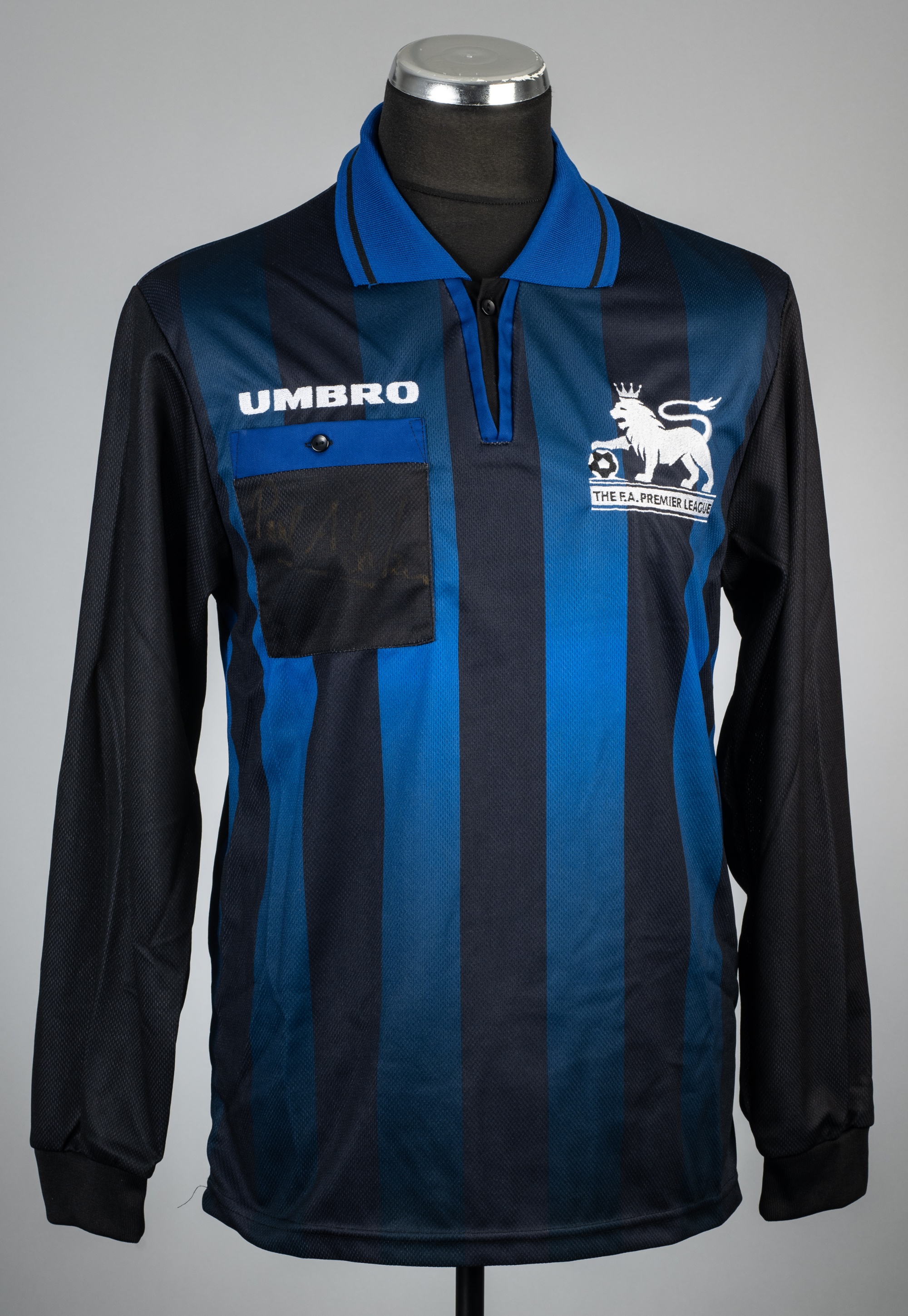 Paul Durkin black and blue striped The F.A. Premier League referee jersey, Umbro, long-sleeved with the FA emblem and embroidered THE F.A. PREMIER LEAGUE, chest buttoned pocket, size L, sold with three newspaper cut-out relating to Paul Durkin refereeing