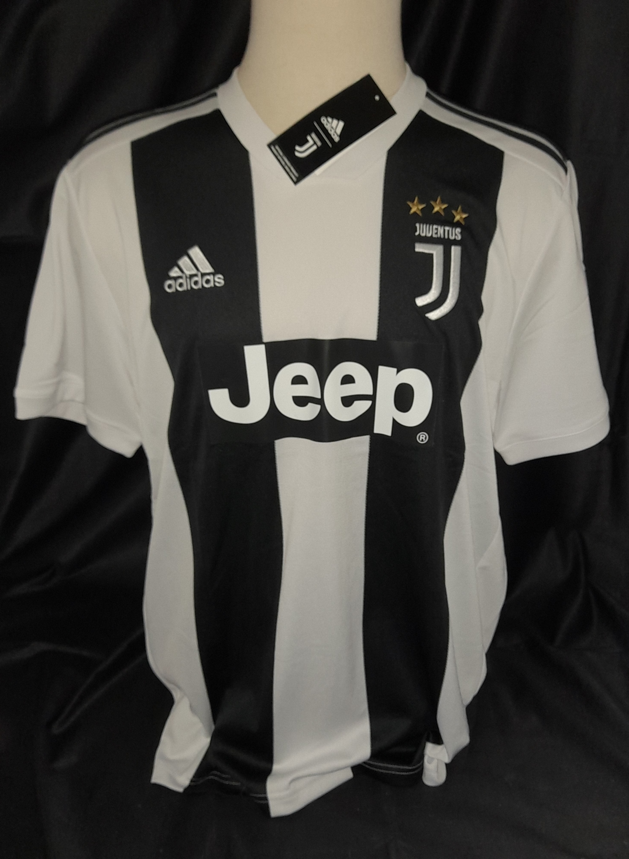 Cristiano Ronaldo signed black and white striped Juventus no.7 replica home jersey, season 2018-19, brand new with tags still attached, Cristiano ha