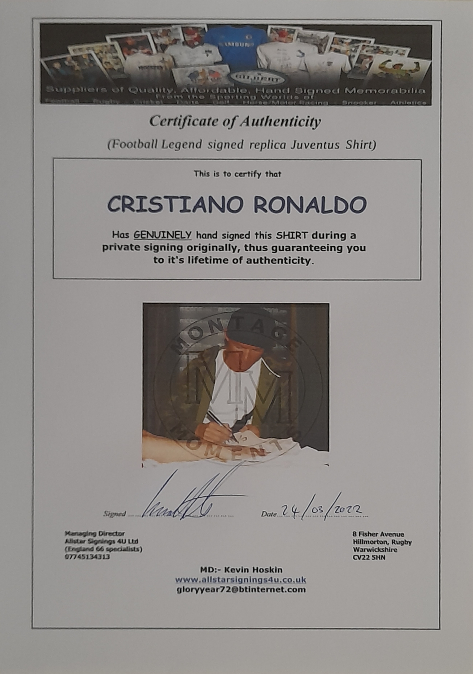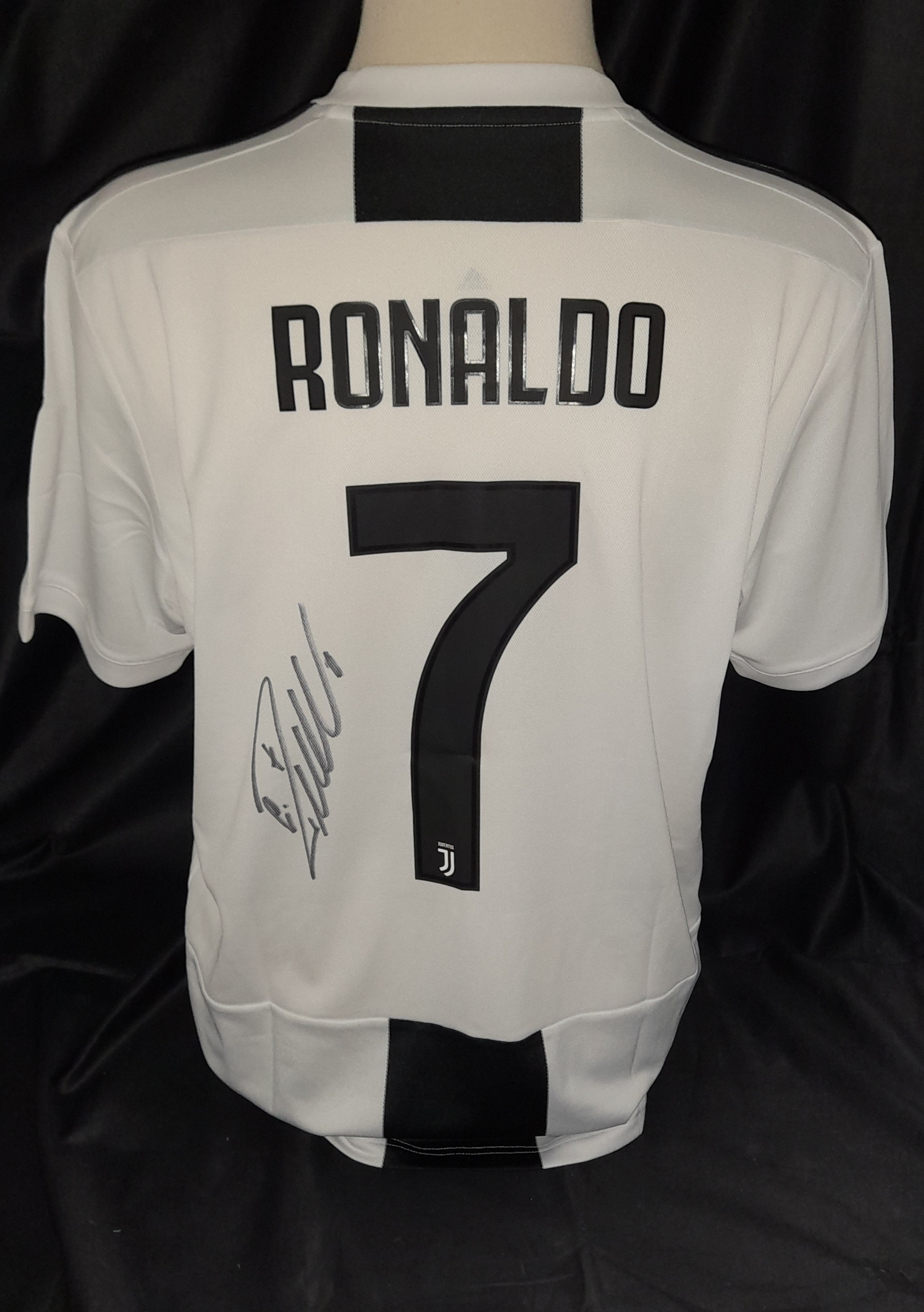Cristiano Ronaldo signed black and white striped Juventus no.7 replica home jersey, season 2018-19, brand new with tags still attached, Cristiano has signed to the reverse below his name and next to his famous No.7