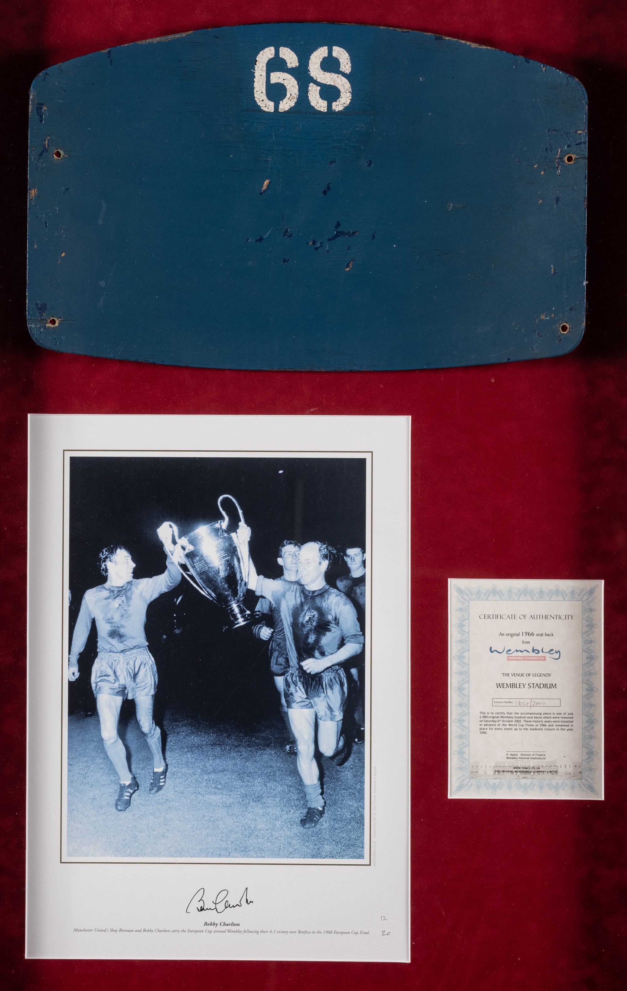Original Wembley Stadium seat back no.68 display with signatures of Manchester United 1968 European Cup legends, the blue painted seat back numbered 68 mounted above "The Venue of Legends Wembley Stadium" COA numbered 1607 of 2000 and a Bobby Charlton signed b & w photograph of Manchester United's Shay Brennan and Bobby Charlton holding the European Cup aloft after defeating Benfica 4-1 in the 1968 European Cup final, signed in black marker pen, glazed and framed, overall 87 by 60cm. All glass will be removed from framed and glazed items prior to posting and may result in delays to shipping your items. (This service is included in the cost of postage and packing). We can also totally remove all framing and mounts upon request to reduce shipping costs. Alternatively lots can be collected in person by prior appointment from NN8 1RT.