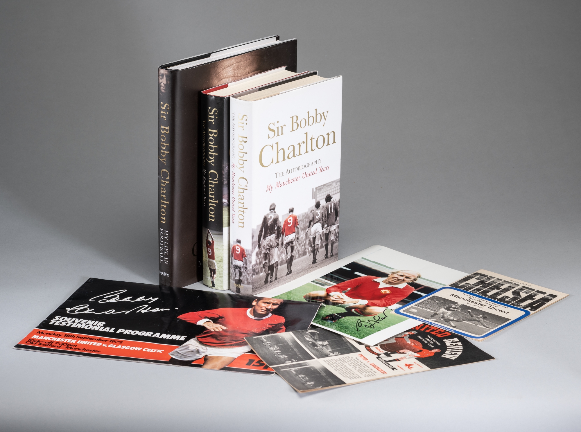 Collection of memorabilia relating to Sir Bobby Charlton, three autographed books "The Autobiography My Manchester United Years", "My England Years" and "My Life in Football"; sold together with a programme for Manchester United debut v Charlton 6th October 1956, and last game for Manchester United v Chelsea 28th April 1973, souvenir of testimonial programme Manchester United v Celtic 18th September 1972; a signed photo 10 by 8in.(7)