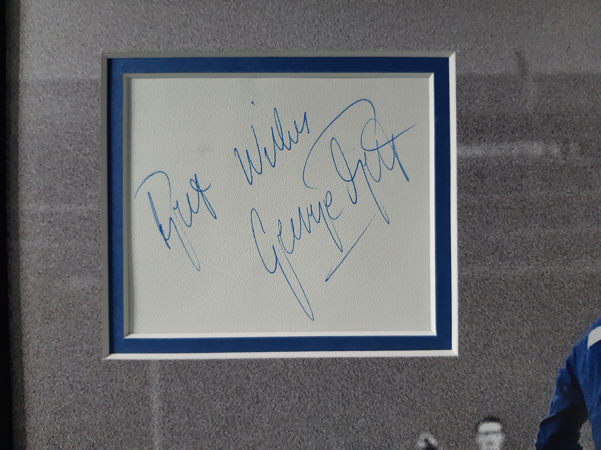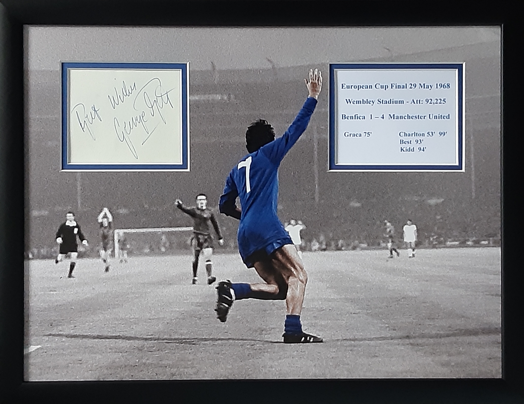 George Best Manchester United 1968 European Cup winner 17.5 by 13.5in. signed framed photo card display, depicting Best reeling away in celebration after scoring against Benfica, autograph was clipped from his biography that he signed and included with lot. All glass will be removed from framed and glazed items prior to posting and may result in delays to shipping your items. (This service is included in the cost of postage and packing). We can also totally remove all framing and mounts upon request to reduce shipping costs. Alternatively lots can be collected in person by prior appointment from NN8 1RT.