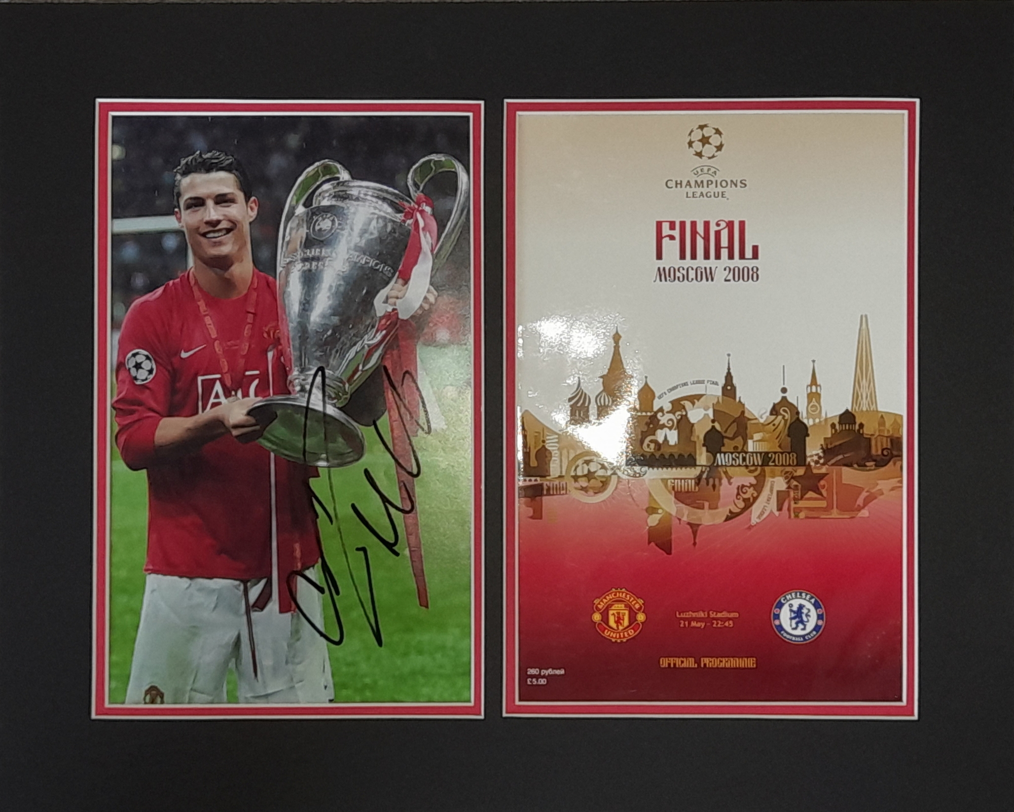 Cristiano Ronaldo signed and mounted 2008 Champions League Manchester United victory over Chelsea display, featuring a photo of Cristiano holding the Champions League trophy along with an original Final programme, mounted to a size of 20 by 16 by 3/4in., making it standard frame size so you can drop into frame of your choice. As you can see by the depth of mount, the programme is held in place by foam, not taped so you can remove if you ever wanted to, Ronaldo signed this at Man Utd's training ground back in 2008, comes complete with COA