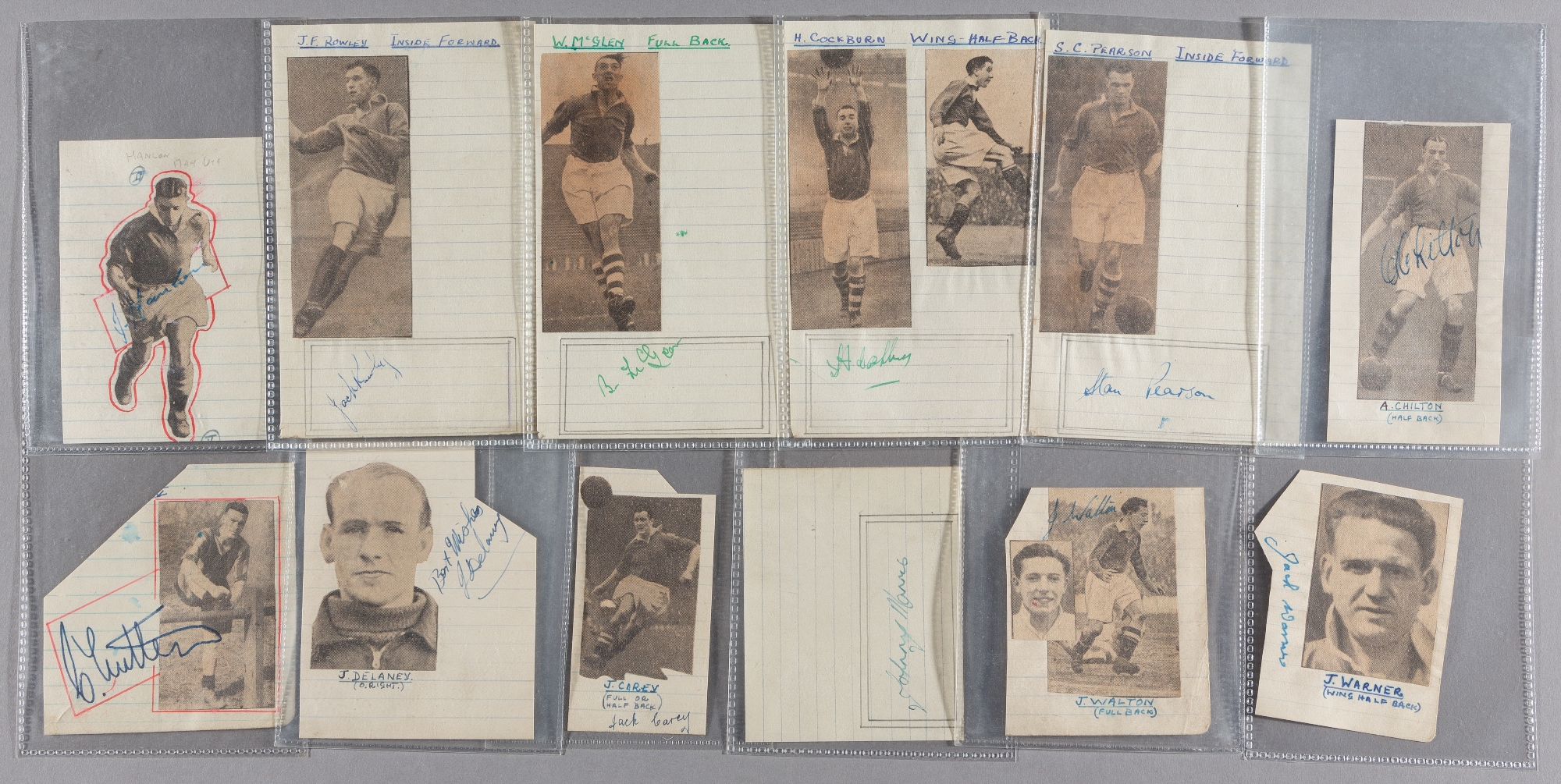 Manchester United autographs 1946 rare collection on newspaper, cut-out to backing paper signed in ink to image of surround, Chilton, Delaney, Morris, Carey, Pearson, Mitten, Rowley, Cockburn (8), all played in 1948 F.A. Cup final winners team, plus Warner, Walton, McGwen, Hanlon, (12)