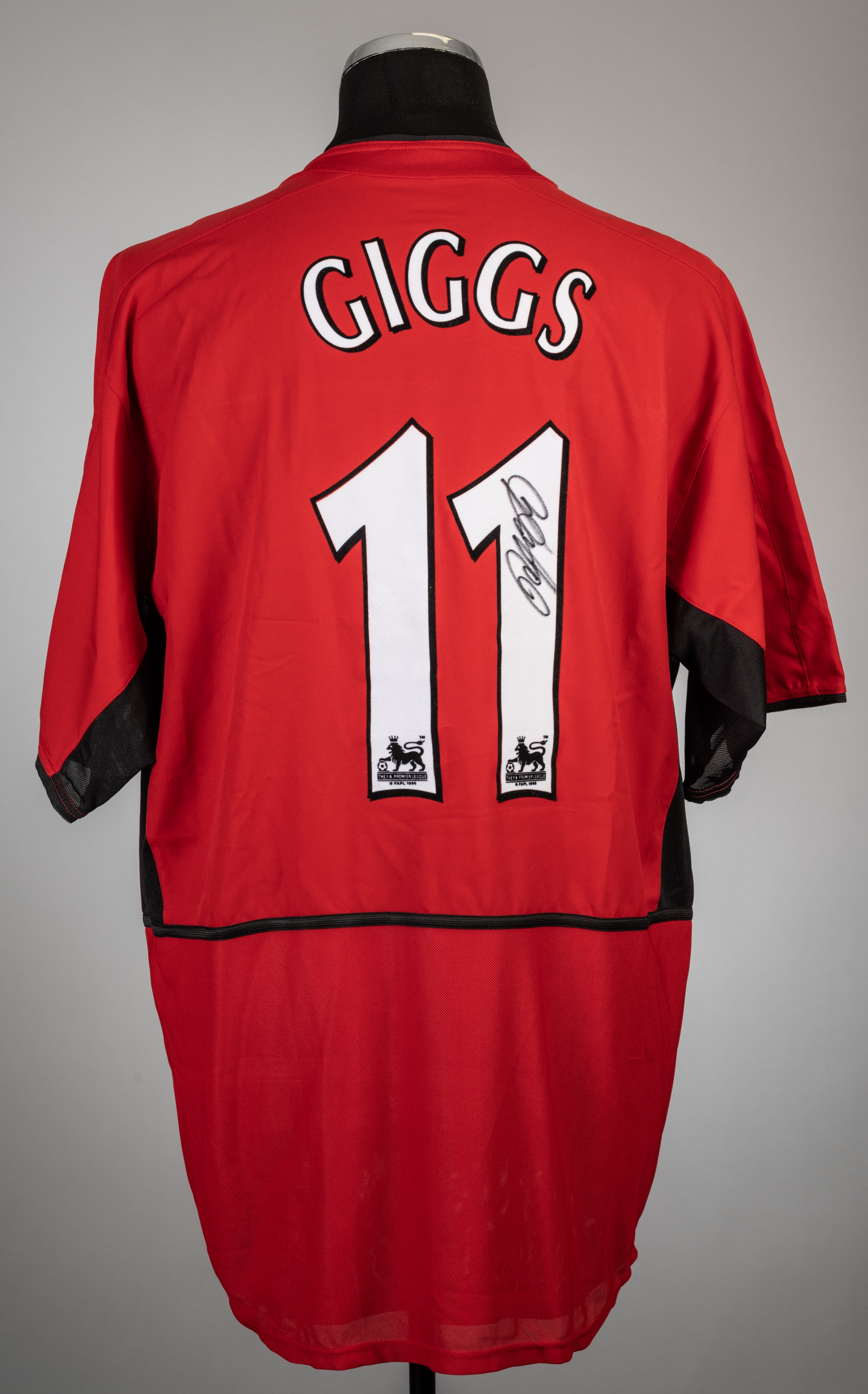 Ryan Giggs signed red Manchester United replica no.11 jersey, season 2002-03, Nike, short-sleeved with club crest and sponsor logo, reverse lettered GIGGS, signed in black marker pen in number one, size XL, with Pixsportique COA