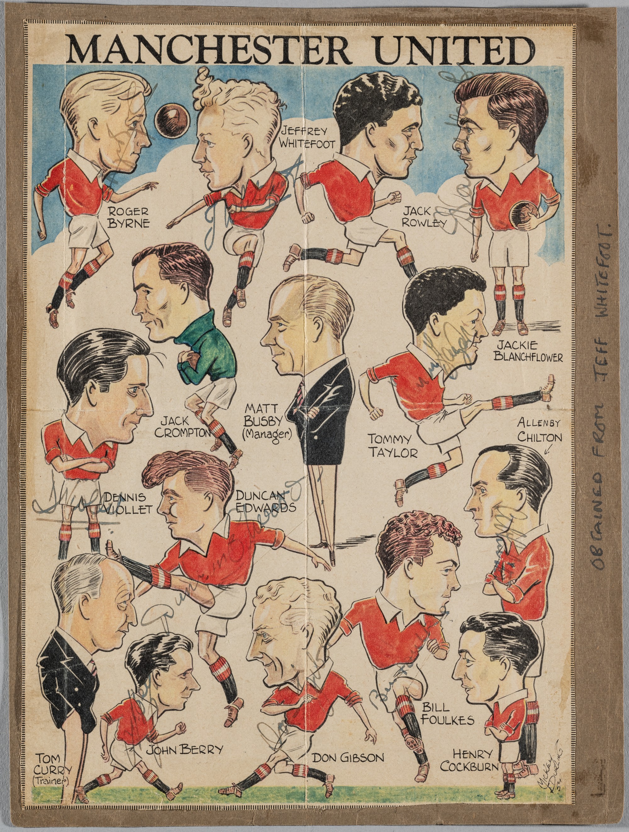 An original mid-1950s caricature sheet including nine Manchester United Busby Babes autographs, comprising: Roger Byrne, Duncan Edwards, Jeff Whitefoot, Jackie Blanchflower, Dennis Viollet, Tommy Taylor, Allenby Chilton, Bill Foulkes and John Berry, 25 by 17cm., mounted and stuck down on paper, bears crease lines Provenance: This was originally owned by United player Jeff Whitefoot