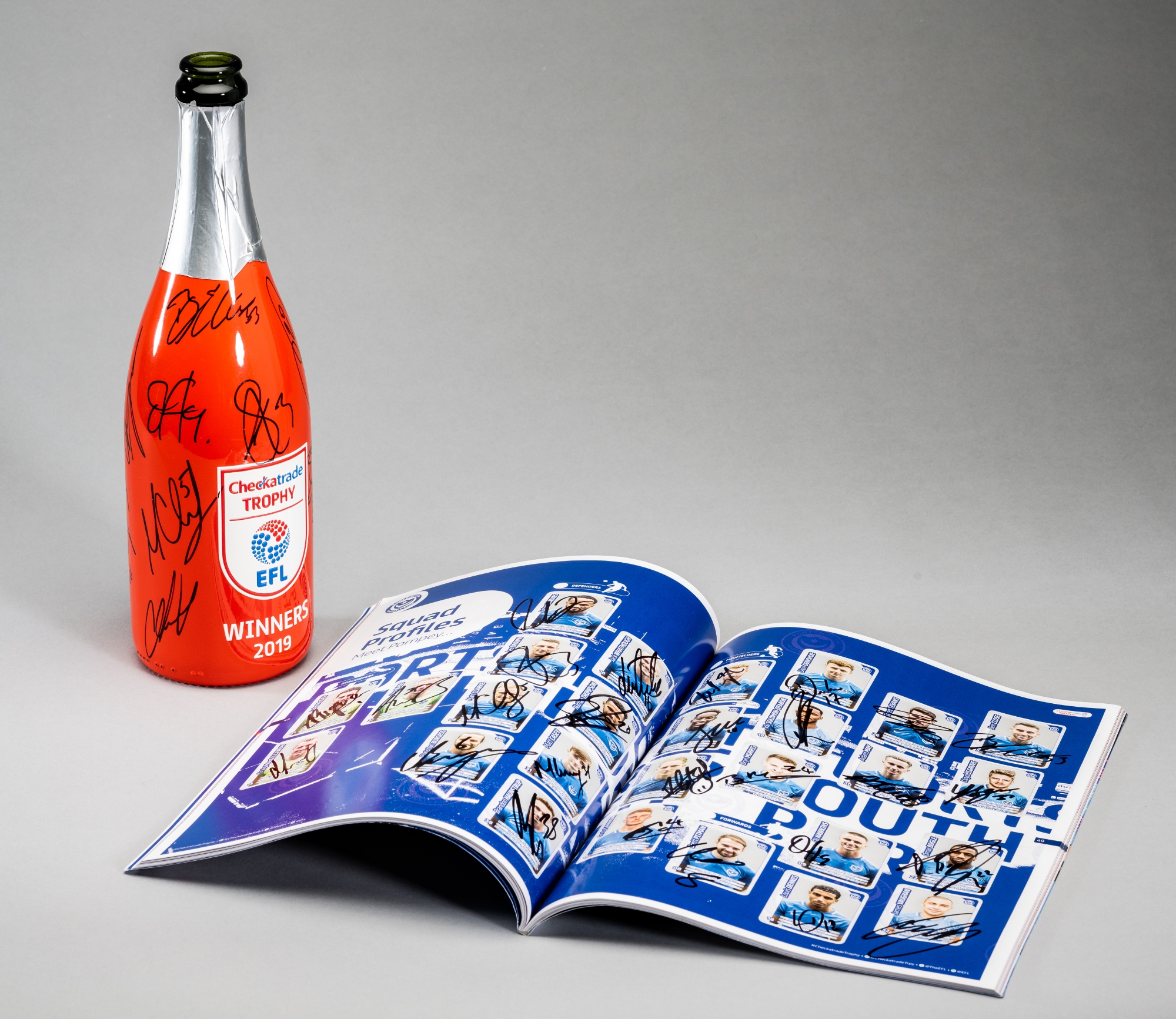Portsmouth team signed Checkatrade EFL trophy final v Sunderland official programme, played at Wembley, 31st March 2019, signed in black marker pen on Portsmouth double page and squad profile page; sold together with Portsmouth signed Checkatrade trophy Efl Winners 2019 champagne bottle (empty), red coated bottle with CHECKATRADE TROPHY EFL WINNERS 2019 logo, signed in black marker pen, (2) Portsmouth defeated Sunderland 5-4 on penalties.
