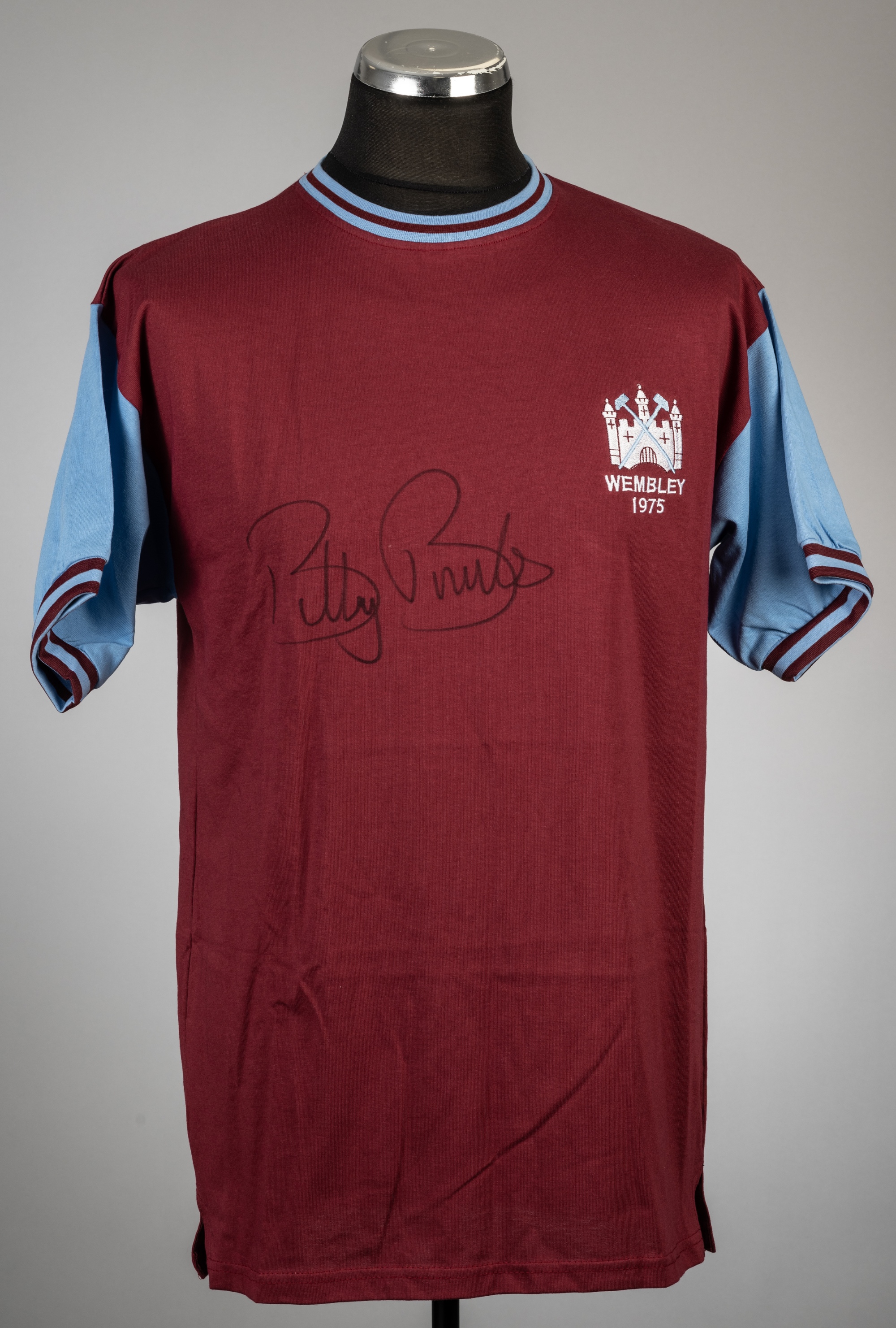 Billy Bonds signed claret West Ham United retro jersey, Score Draw, short-sleeved with club crest, embroidered WEMBLEY 1975, signed in black marker p