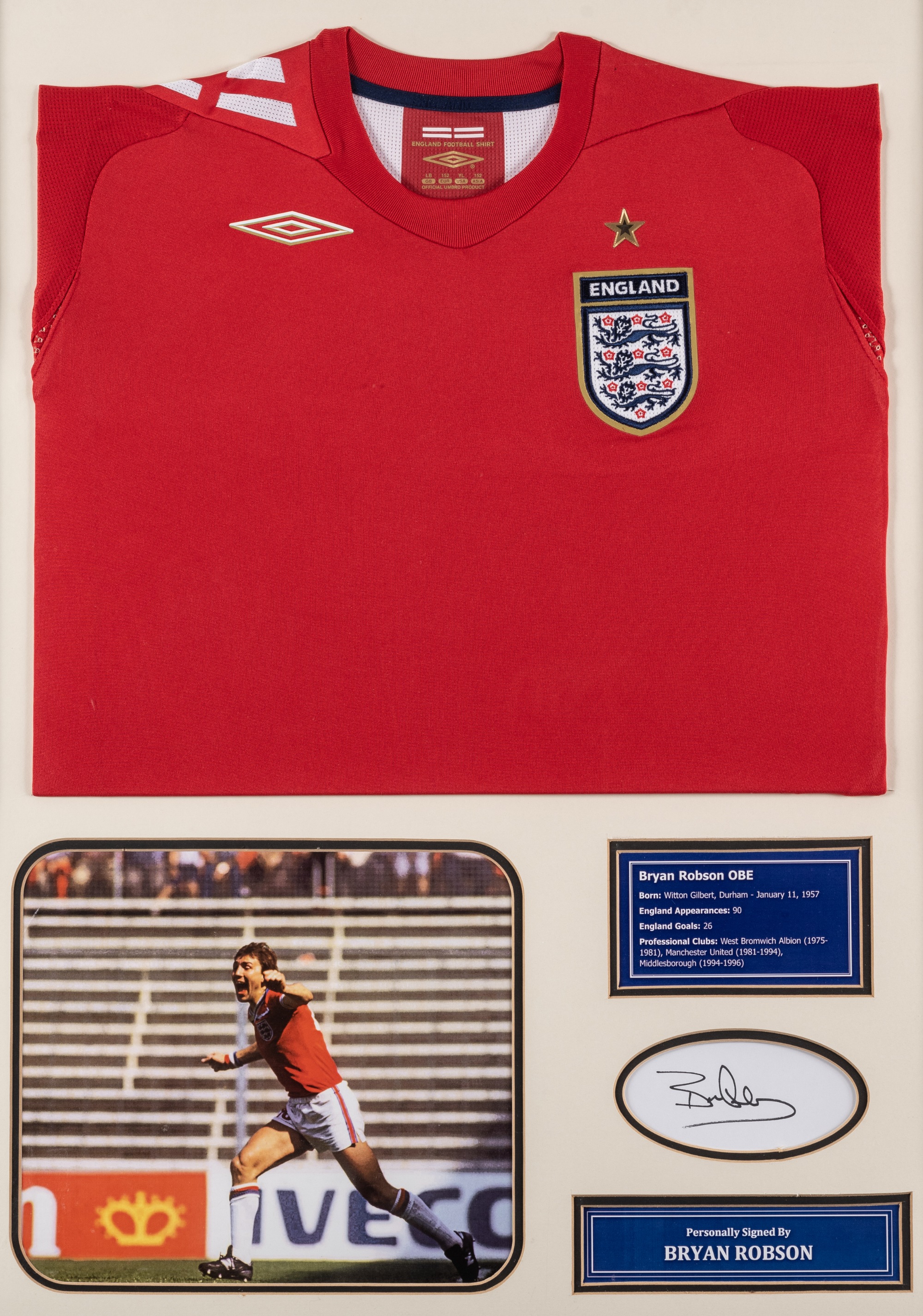 Bryan Robson signed England display, comprising red England retro jersey embroidered with national three lion emblem and Umbro logo, mounted above a 20 by 24cm. colour photograph of Bryan Robson playing for England; a signed autograph page in black marker pen and two type legends, glazed and framed, overall 80 by 60cm., with Heroes Memorabilia COA to reverse. All glass will be removed from framed and glazed items prior to posting and may result in delays to shipping your items. (This service is included in the cost of postage and packing). We can also totally remove all framing and mounts upon request to reduce shipping costs. Alternatively lots can be collected in person by prior appointment from NN8 1RT.