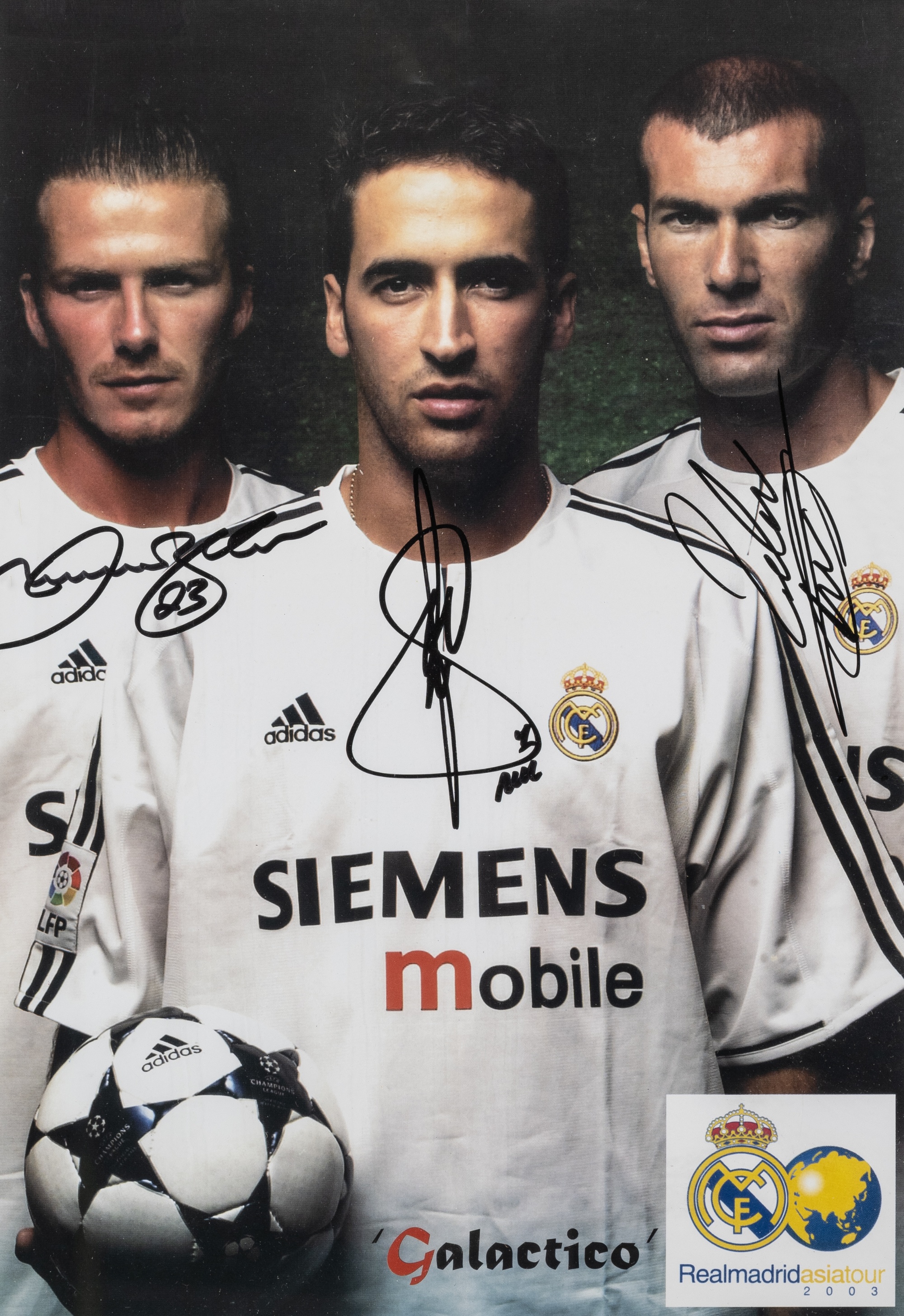 A Real Madrid "Galactico" David Beckham, Raul and Zinedine Zidane signed colour photographic print, signed in black marker pen, mounted, glazed and
