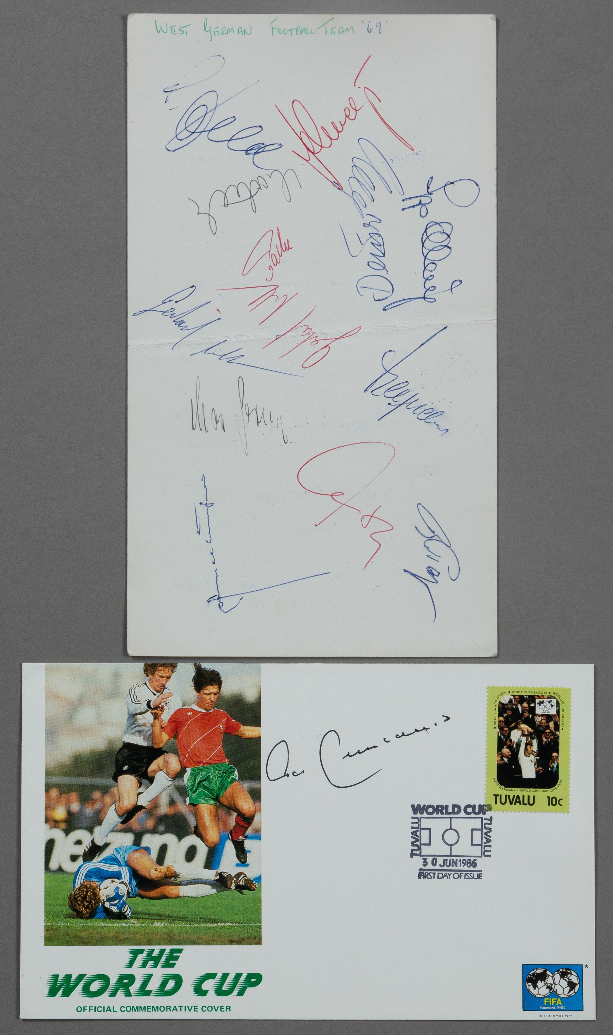WEST GERMANY v SCOTLAND – WORLD CUP GROUP 7 QUALIFYING MATCH AGAINST SCOTLAND AT HAMPDEN PARK 13th APRIL, 1969 - NICELY SIGNED MARINE HOTEL, TROON, SCOTLAND MENU BY THE WEST GERMAN TEAM Original menu from the Marine hotel, Troon, Scotland, dated 13th April, 1969, signed to the blank back by 14 of the WEST GERMAN TEAM for the 1970 WORLD CUP GROUP 7 QUALIFYING MATCH AGAINST SCOTLAND AT HAMDEN PARK, GLASGOW, 16th APRIL, 1969. Autographs include: GERD MULLER x2, WOLFGANG OVERATH, SIGI HELD, MAX LORENZ, WOLFGANG OVERATH, SEPP MAIER, et al. Minor central horizontal fold mark, otherwise in good condition. SOLD WITH A FRANZ BECKENBAUER 1974 GERMANY WORLD CUP WINNER AUTOGRAPHED FIRST DAY COVER, THE STAMP BEARING A DEPICTION OF THE 1954 WORLD CUP FINAL BETWEEN GERMANY AND HUNGARY.