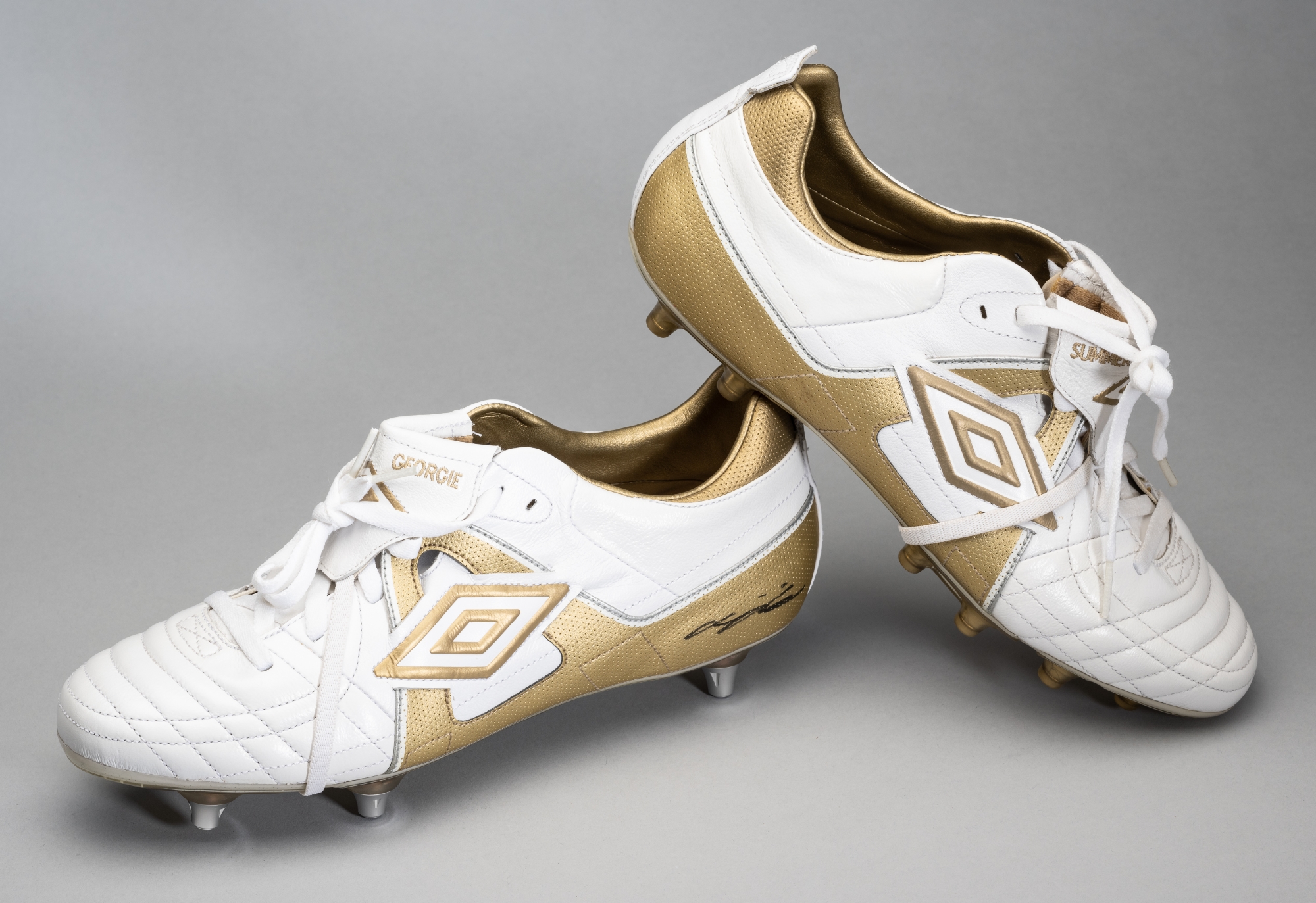 A sample pair of Chelsea's John Terry signed Umbro FA10 football boots, white and gold leather boots with George and Summer and number six embroidered into fold-over tongue, right boot with moulded studs label number FA10-UMBRO-002SF, left boot with six metal studs label number FA10-UMBRO-001SF, signed in black marker pen on the heal of the left boot, size 10.5 US, excellent clean un-used condition