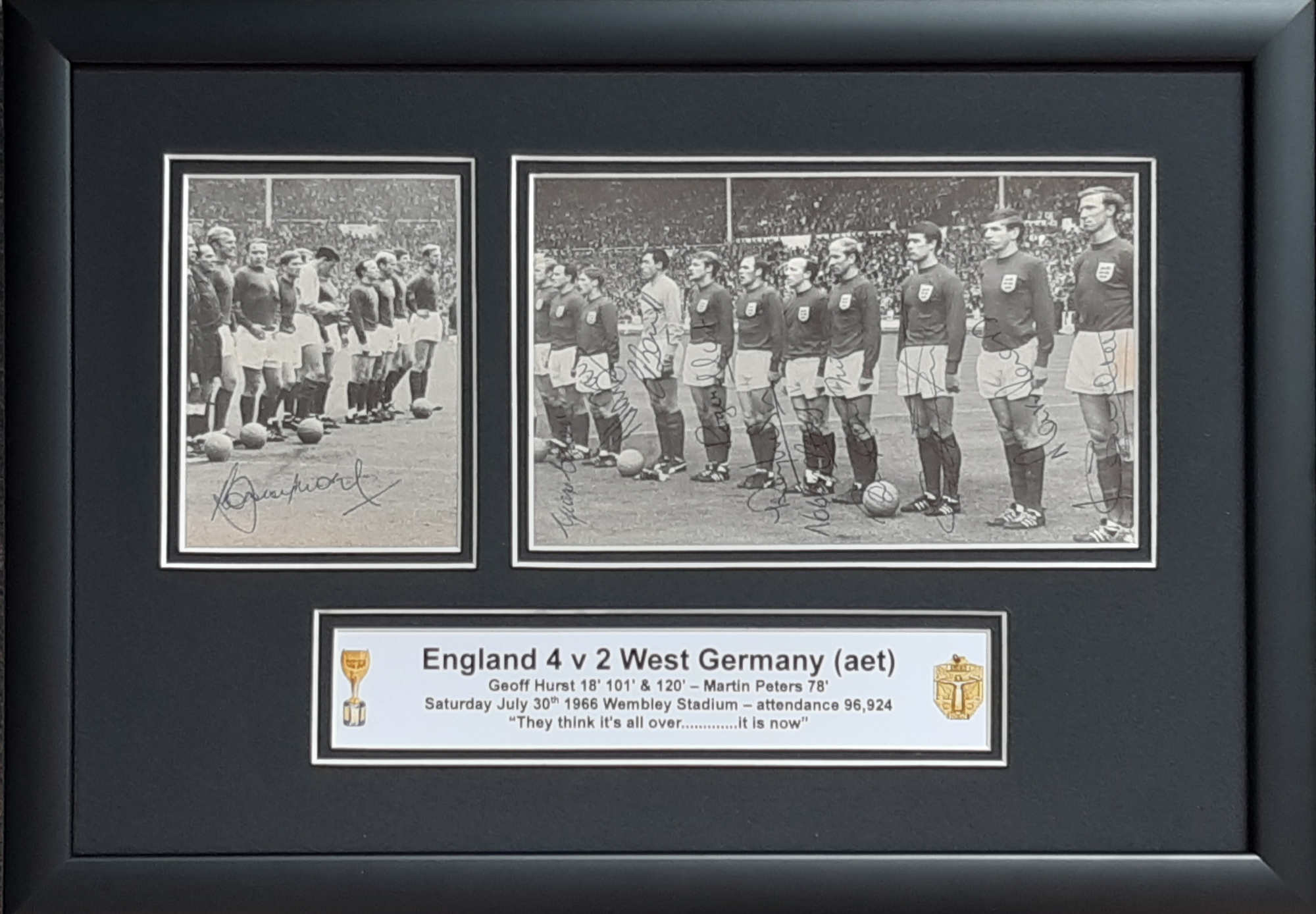England 1966 World Cup Winners signed & framed display showing the team lining up on the Wembley turf prior to kick off against West Germany back on Saturday 30th July 1966, autographed to left hand side image by captain Bobby Moore with reflection image signed by from left to right, George Cohen, Alan Ball, Gordon Banks, Roger Hunt, Ray Wilson, Nobby Stiles, Bobby Charlton, Geoff Hurst, Martin Peters and Jack Charlton. All neatly and boldly signed in blue biro over themselves, frame measures 17 by 12in., comes complete with COA. All glass will be removed from framed and glazed items prior to posting and may result in delays to shipping your items. (This service is included in the cost of postage and packing). We can also totally remove all framing and mounts upon request to reduce shipping costs. Alternatively lots can be collected in person by prior appointment from NN8 1RT.