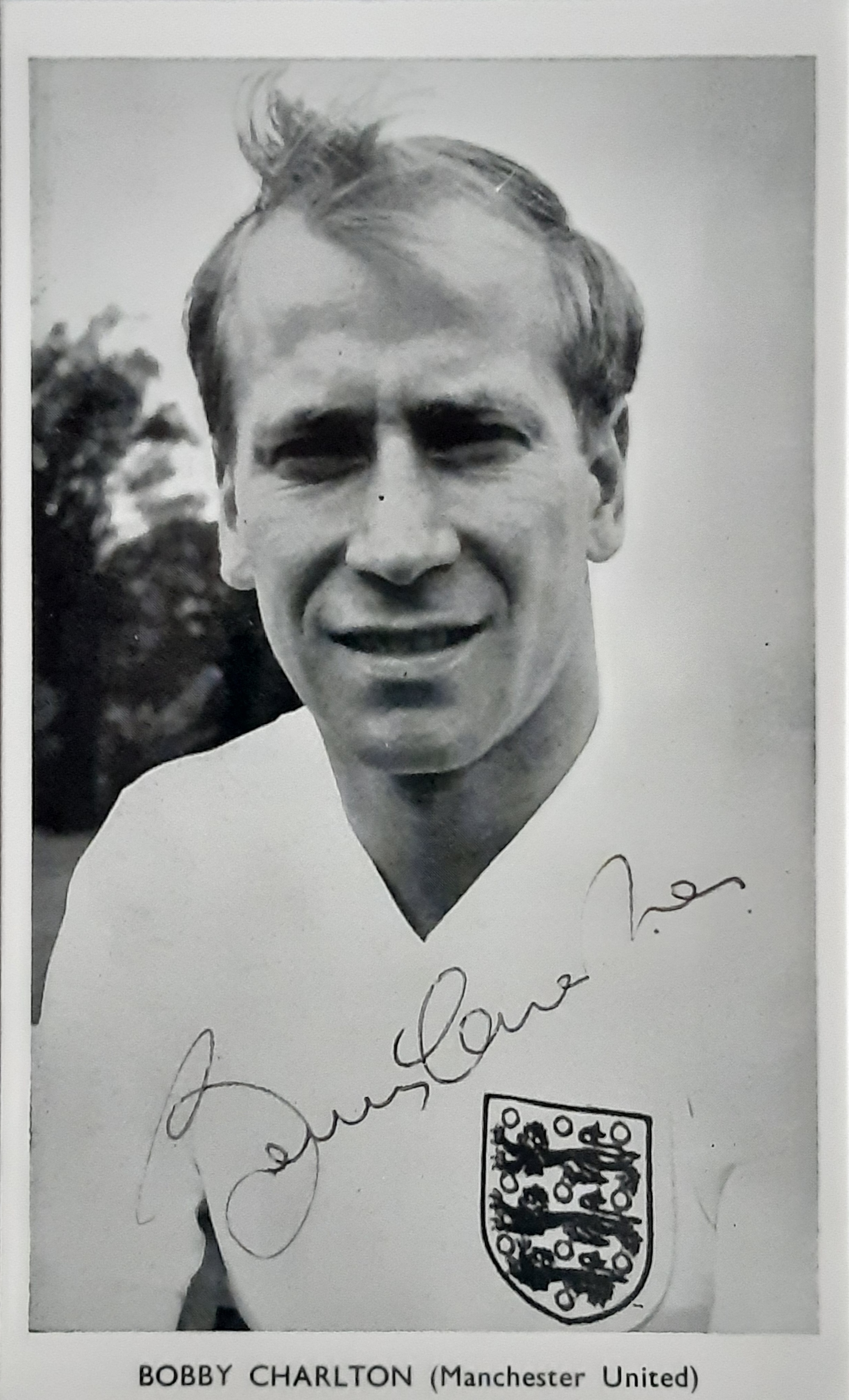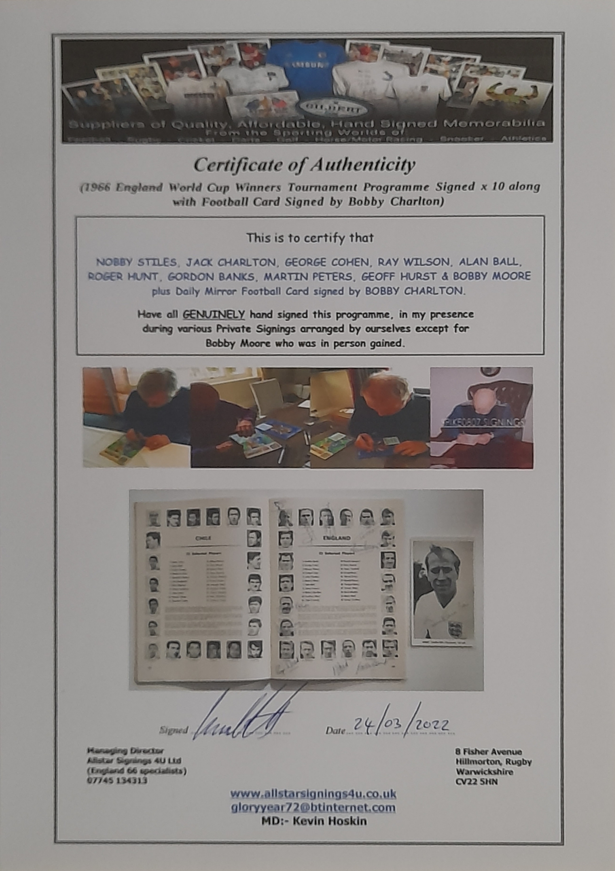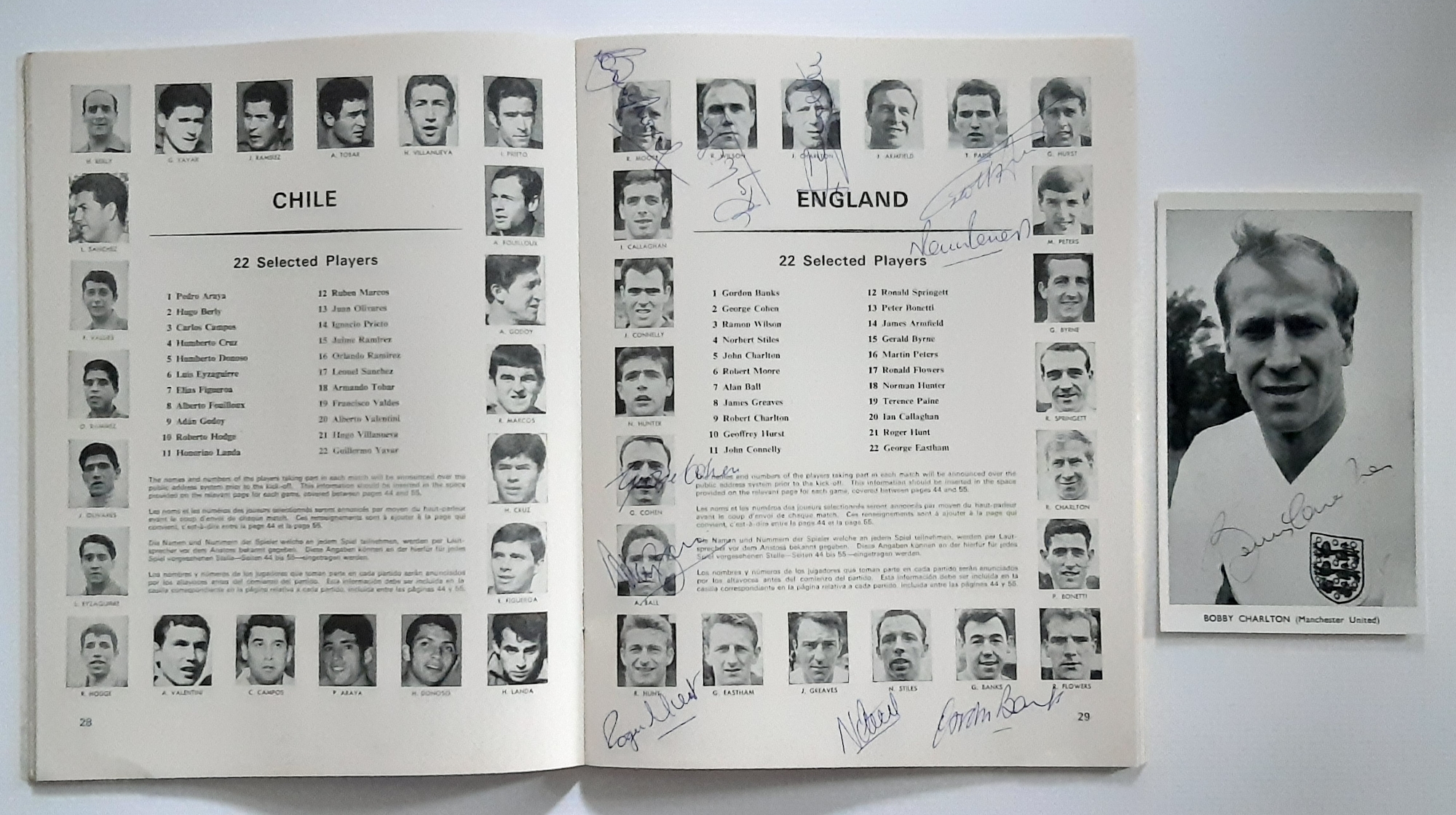 England 1966 World Cup winners original tournament programme in mint condition, Cadets cigarette and Players No.6 being correct colouring etc, signed by 10 of the team neatly in blue biro, Bobby Moore, Alan Ball, Martin Peters, Roger Hunt, Nobby Stiles, Jack Charlton, George Cohen, Gordon Banks, Ray Wilson and Geoff Hurst, as you can see from images all the colours of cigarette packets as should be, making up the full team Bobby Charlton is added on an old football collectors signed card