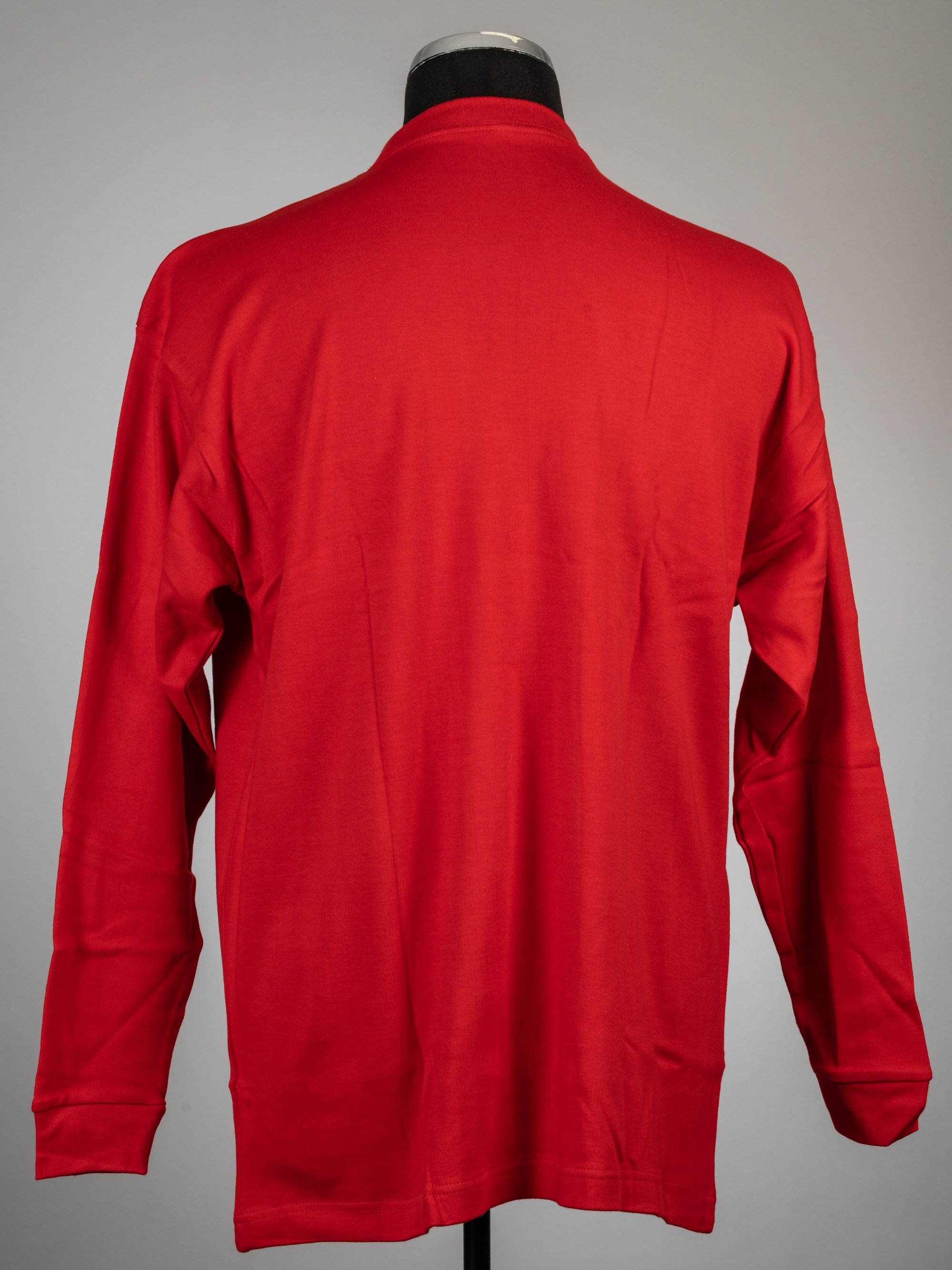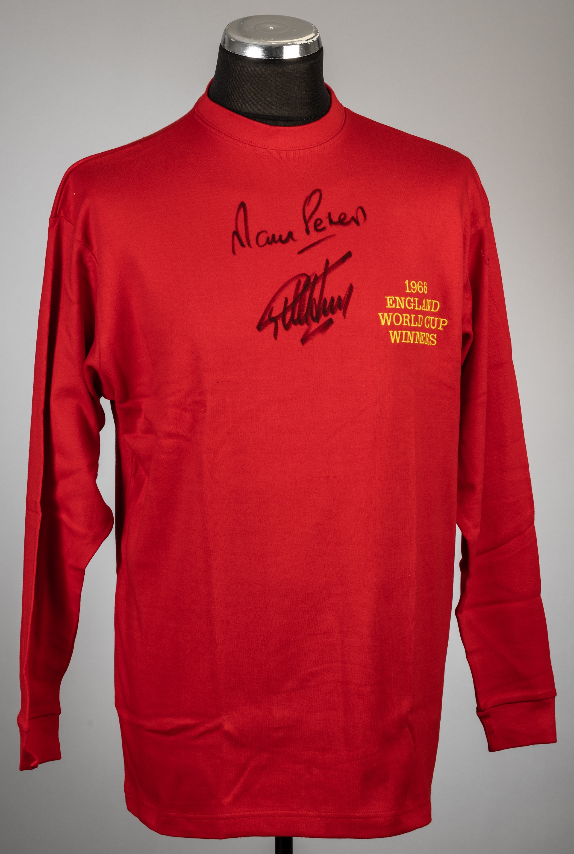Geoff Hurst & Martin Peters signed red 50th anniversary 1966 England World Cup Winners commemorative jersey, long-sleeved embroidered 1966 ENGLAND WORLD CUP WINNERS, signed in black marker pen on front, size L