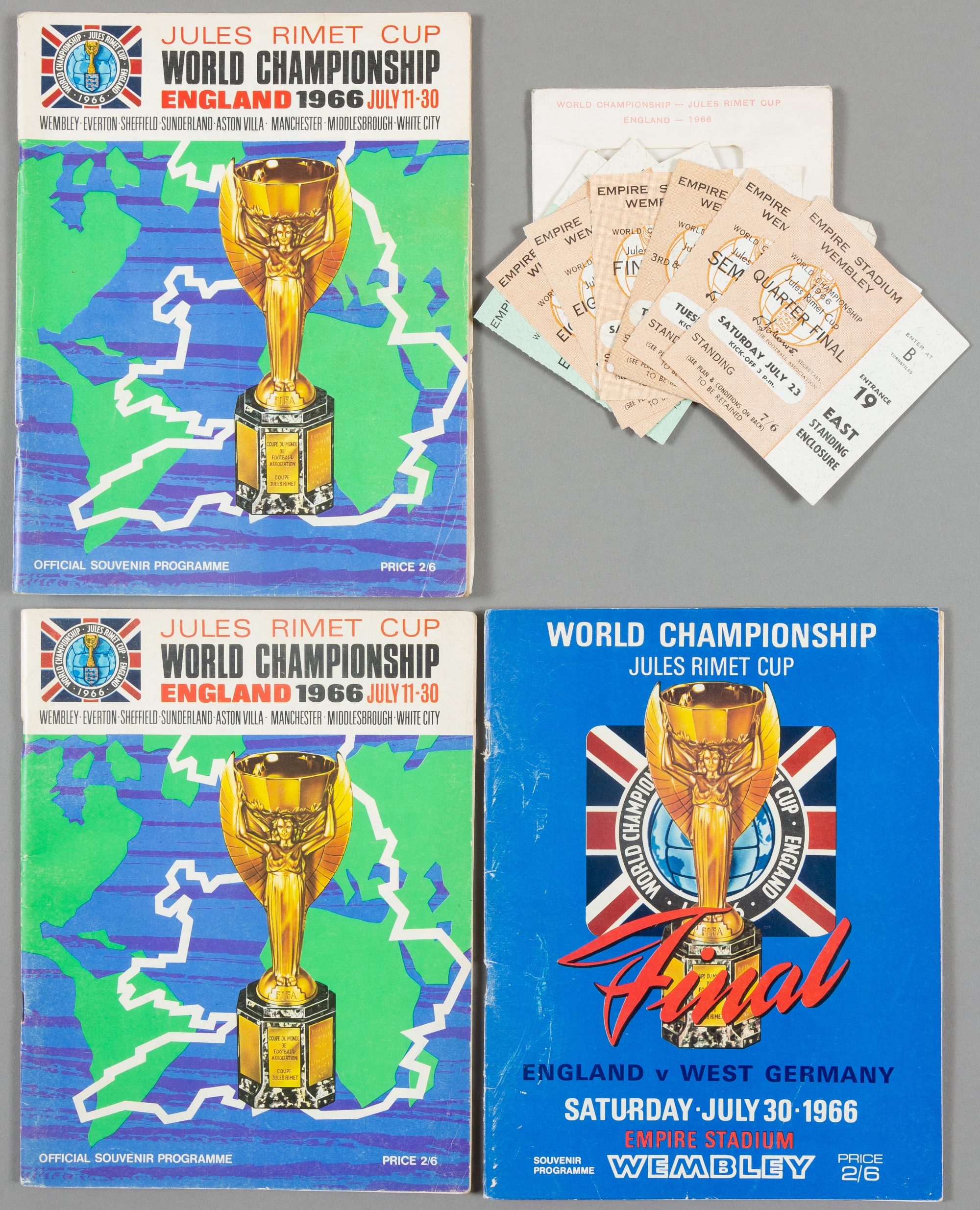 England 1966 World Cup programmes and tickets, the final programme and two souvenir tournament programmes; and a paper wallet containing tickets for the final, 3rd/4th, s/f, q/f and England's three Group matches