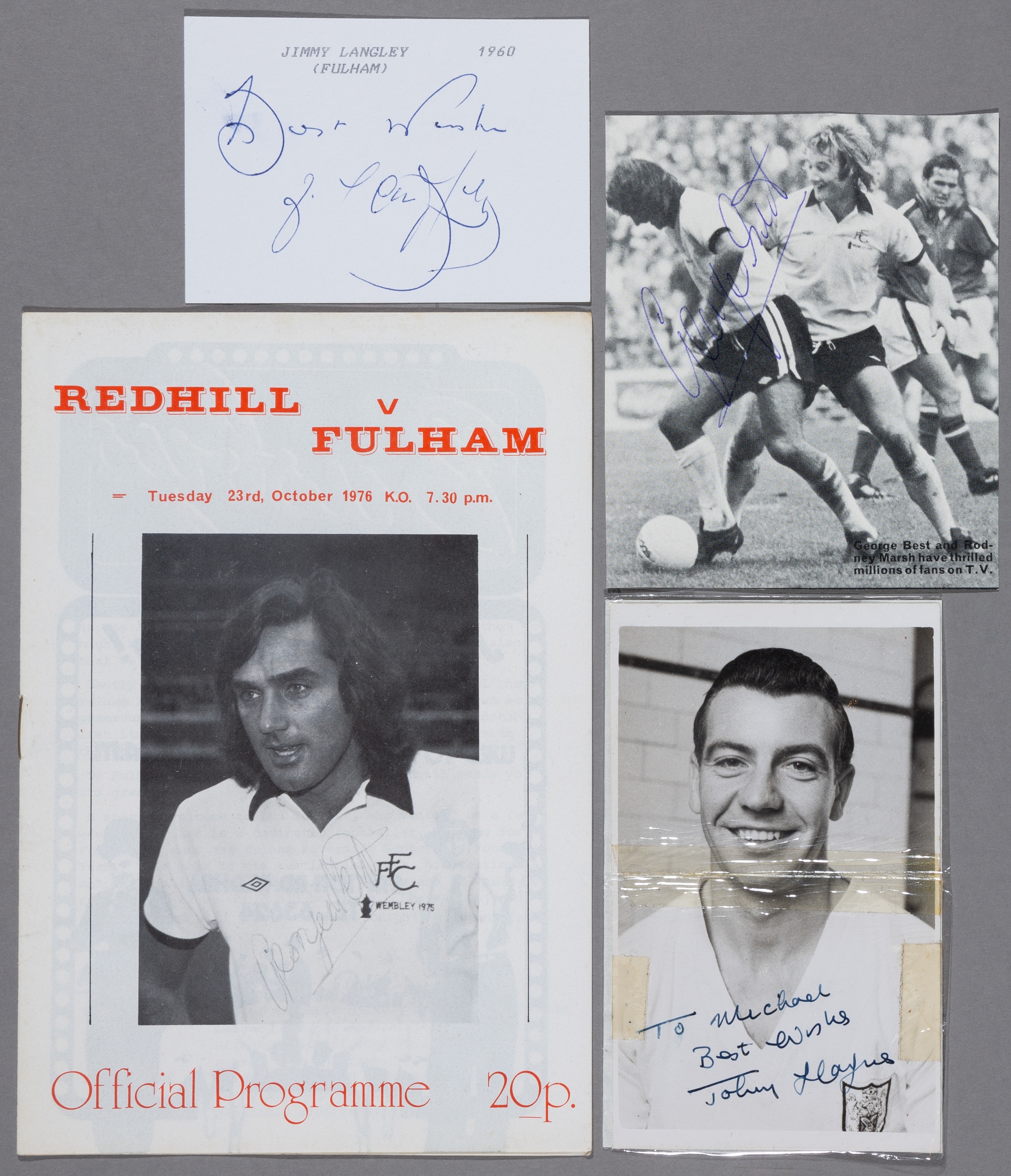 George Best, Johnny Haynes and Jimmy Langley Fulham autographs, a Best signed programme at Redhill 23.10.76 and a signed magazine photo; a Haynes sig