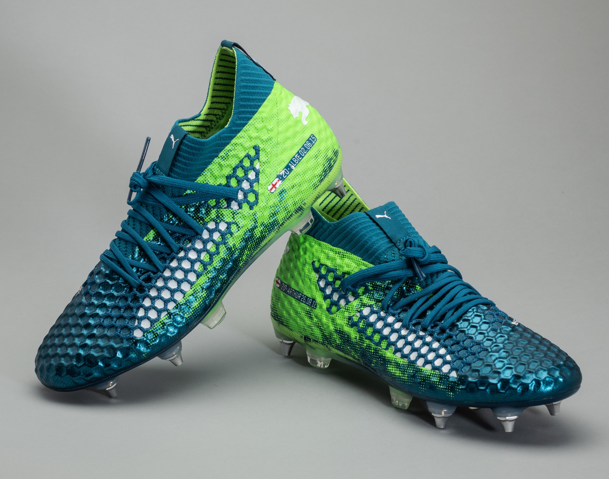 England's Adam Lallana Puma Future promotional sample football boots, lime green and turquoise boots, with moulded blades, each bearing England flag, squad number 20 and children's names, size 7, un-used ready to wear