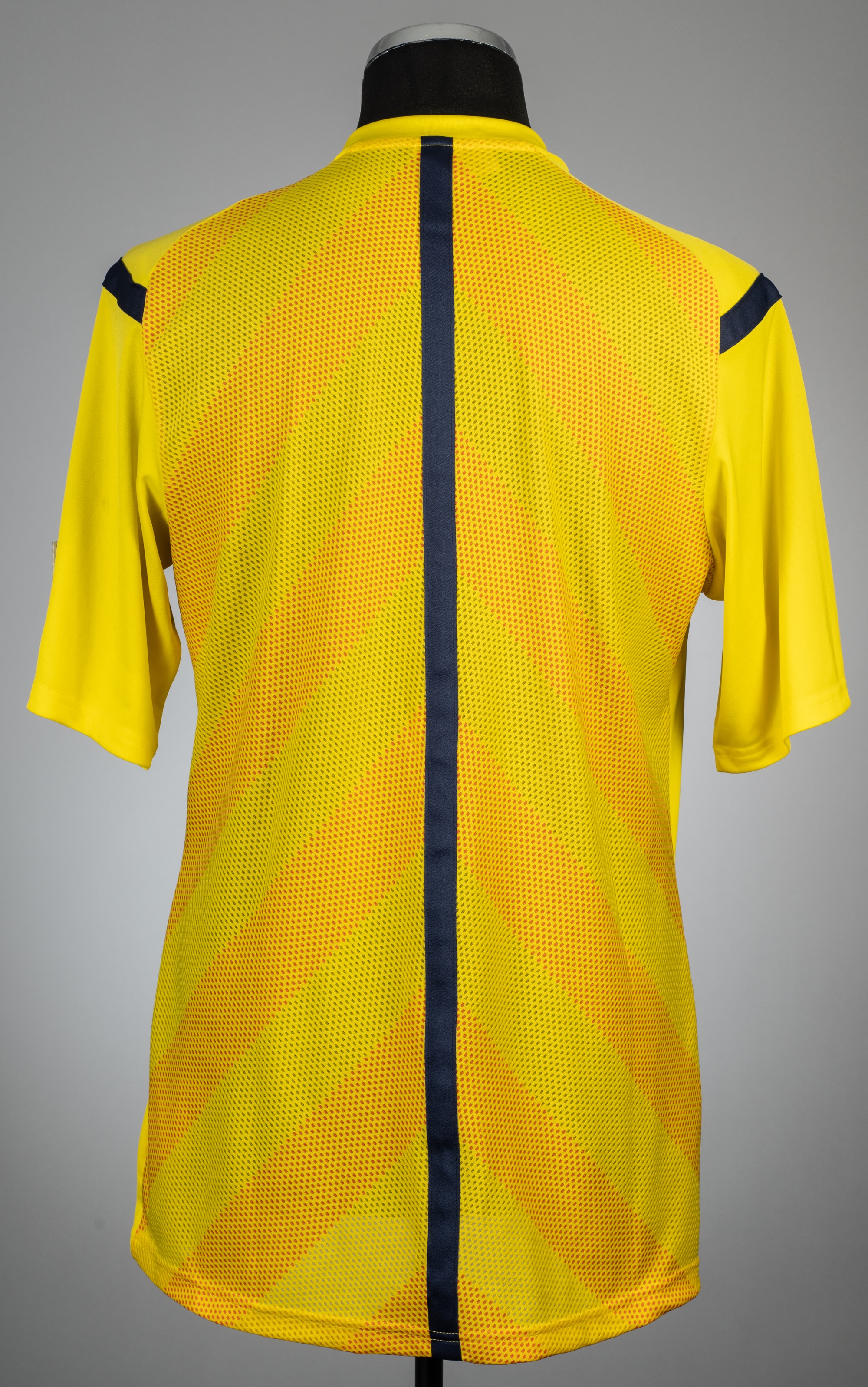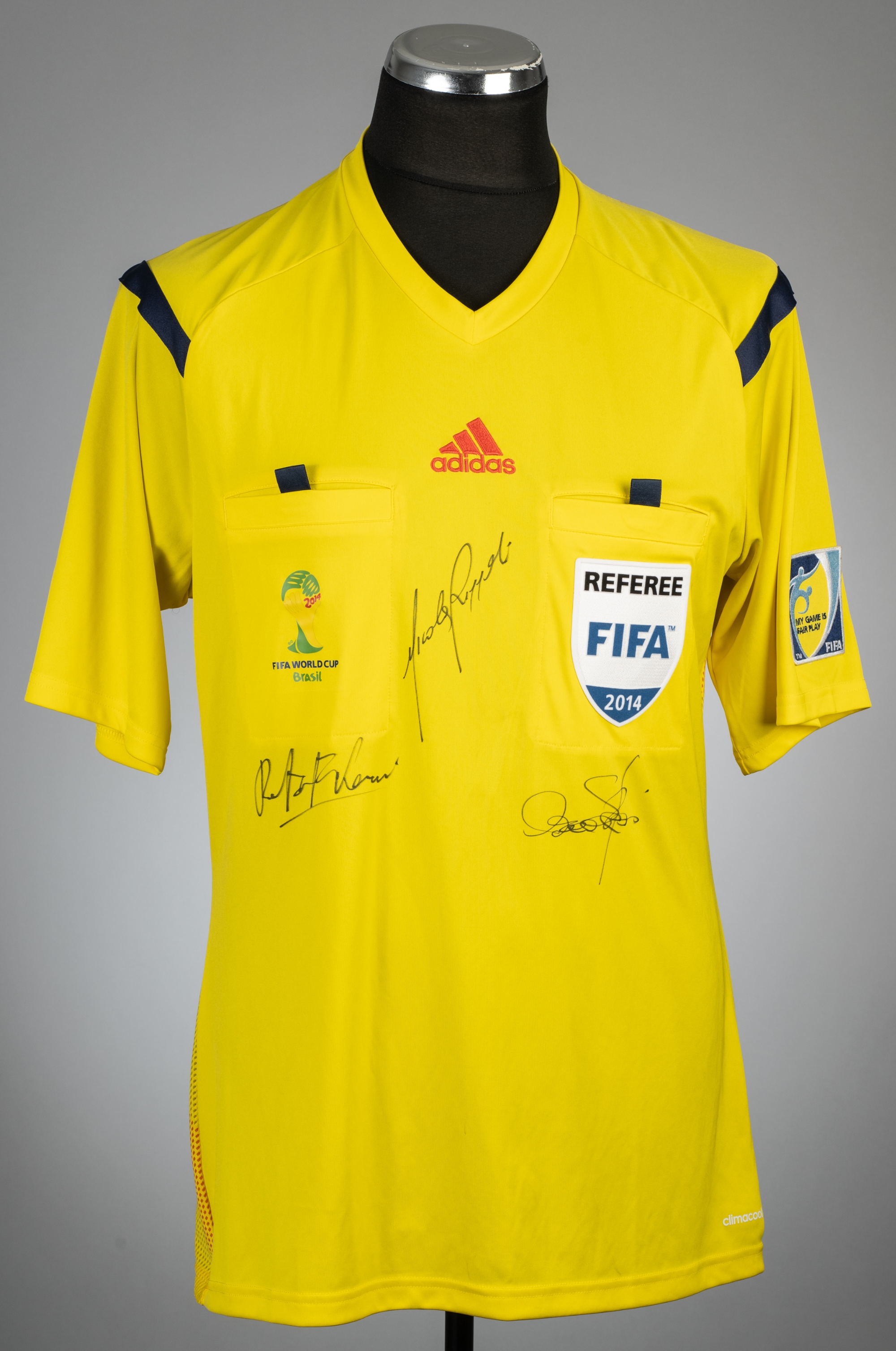 Yellow signed Brazil FIFA World Cup 2014 referee's jersey, Adidas, short-sleeved with FIFA MY GAME IS FAIR PLAY sleeve badge, REFEREE FIFA 2014 chest badge, FIFA WORLD CUP BRAZIL 2014 pocket transfer, size L, signed in black marker pen on the front by match referee Nicola Rizzoli and the two assistants Renato Faverani and Andrea Stefani The auction proceeds for this lot will be donated to the Yorkshire-based children's charity PhysCap. The shirt was acquired for the purposes of the donation by former FIFA referee Howard Webb.