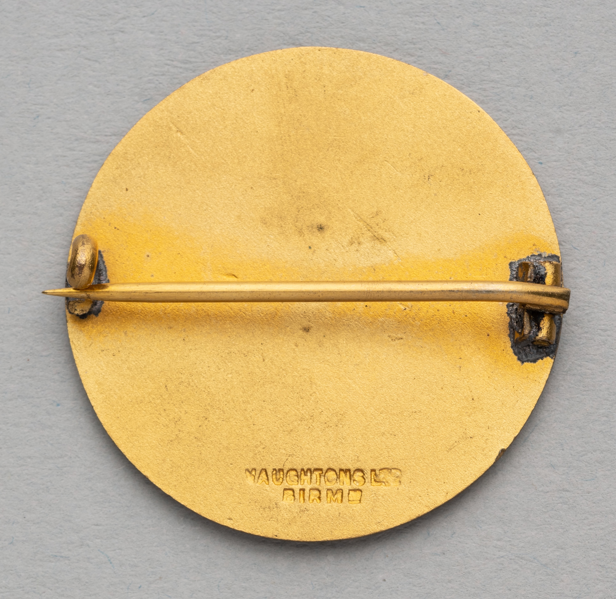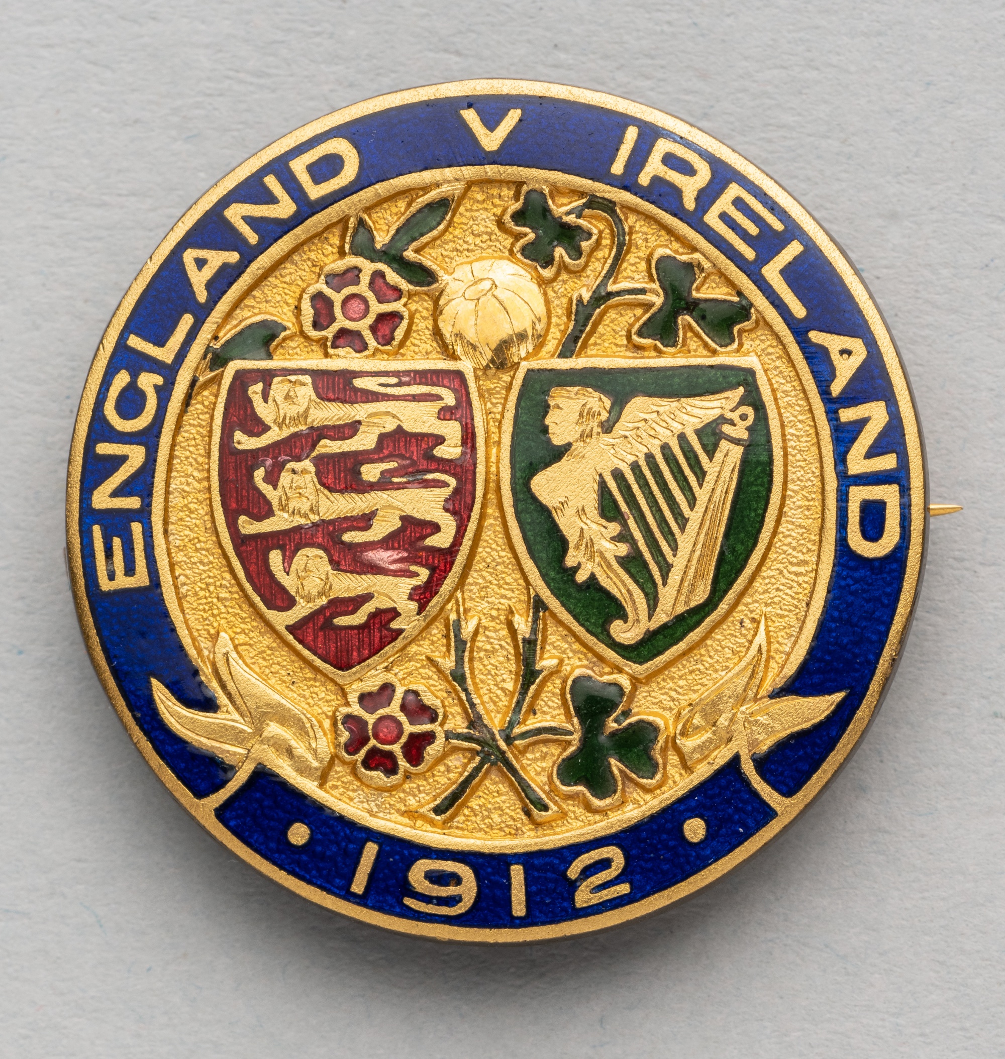 England v Ireland enamelled lapel badge for the Home International Championship, played at Dalymount Park, Dublin, 10th February 1912, obverse enamelled with England and Ireland national emblem shields and ENGLAND v IRELAND 1912, reverse with lapel pin clasp and impressed VAUGHTONS LTD BIRMING, gilt metal, diameter 32mm., bears repair mark at clasp attachment England defeated Ireland 6-1.