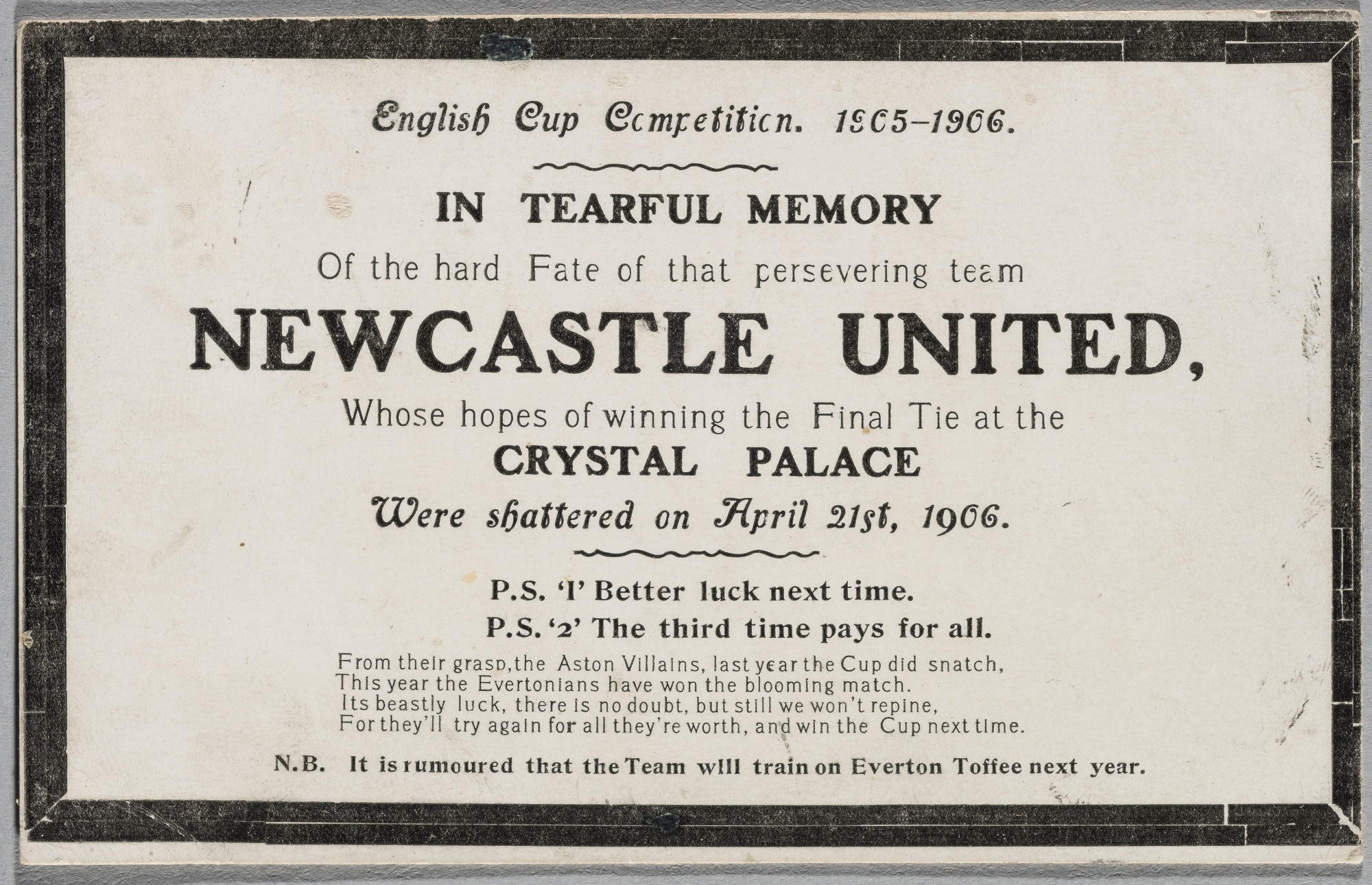 English Cup Competition 1905-1906 humorous postcard relating to the FA Cup final between Newcastle United's v Crystal Palace on 21st April 1906, in the style of a memorial card for the Newcastle United's loss to Crystal Palace, in the FA Cup final on 21st April 1906, bears stamp and postage mark to reverse with writing in black ink, 9 by 14cm.