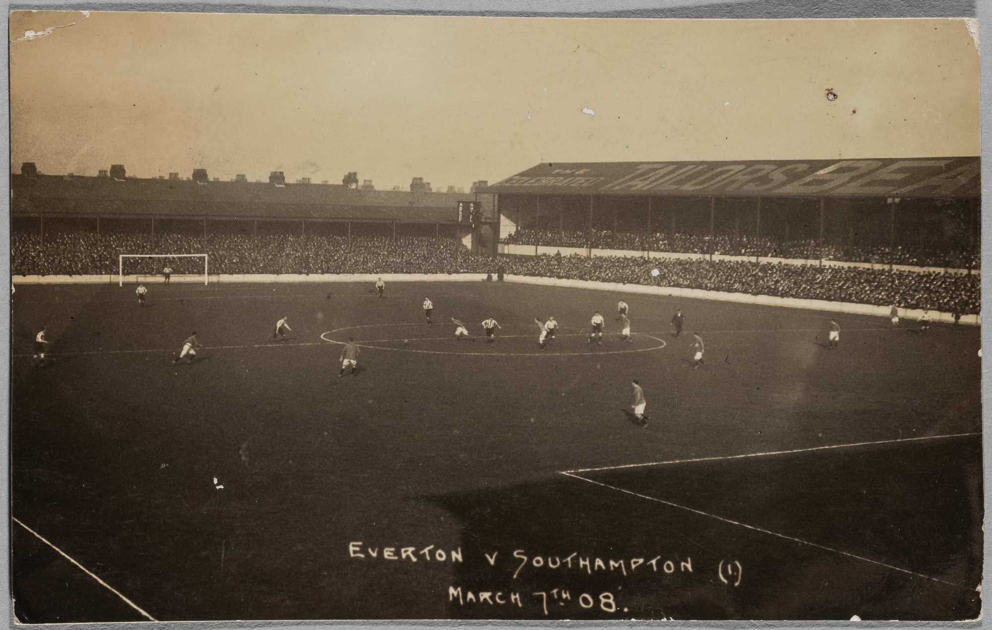 Everton v Southampton match postcard, 7th March 1908, featuring match action, reverse with stamp and postage mark and writing in black ink, 8.5 by 13.5cm., bears wear