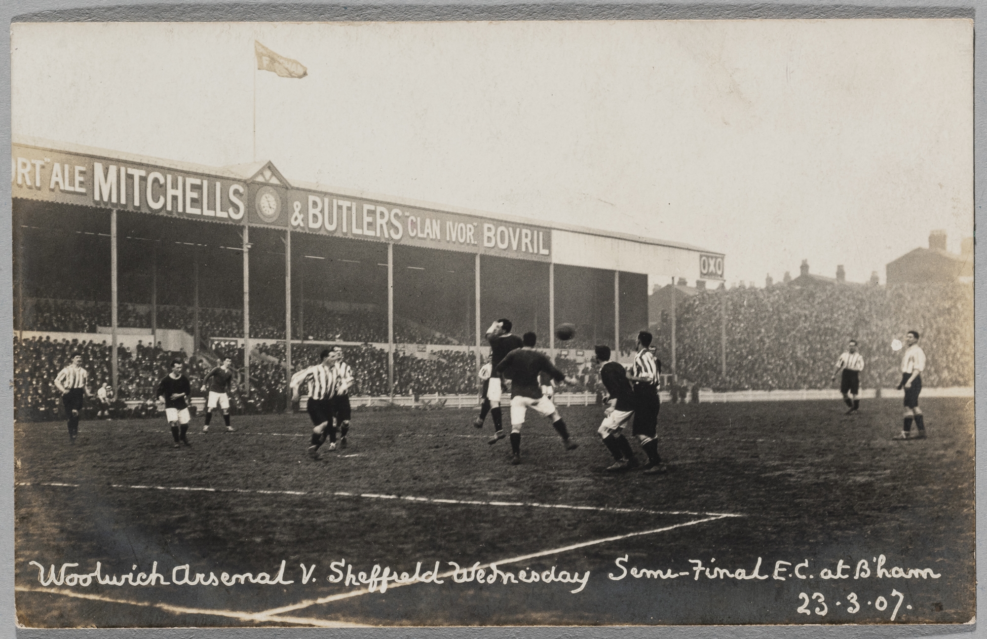 Woolwich Arsenal v Sheffield Wednesday postcard in the F.A. semi-final at Birmingham, 23rd March 1907, featuring match action, revere with pencil annotation, 9 by 14cm. Sheffield Wednesday defeated Woolwich Arsenal 3-1.