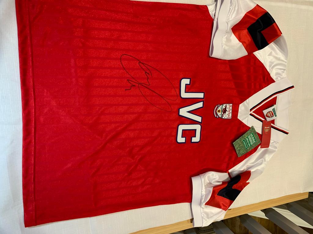Patrick Vieira signed red and white Arsenal replica home jersey 1992-93, Score Draw, short-sleeved with club crest and sponsor logo, signed in marker pen to front, with retail tag, with COA and photo proof