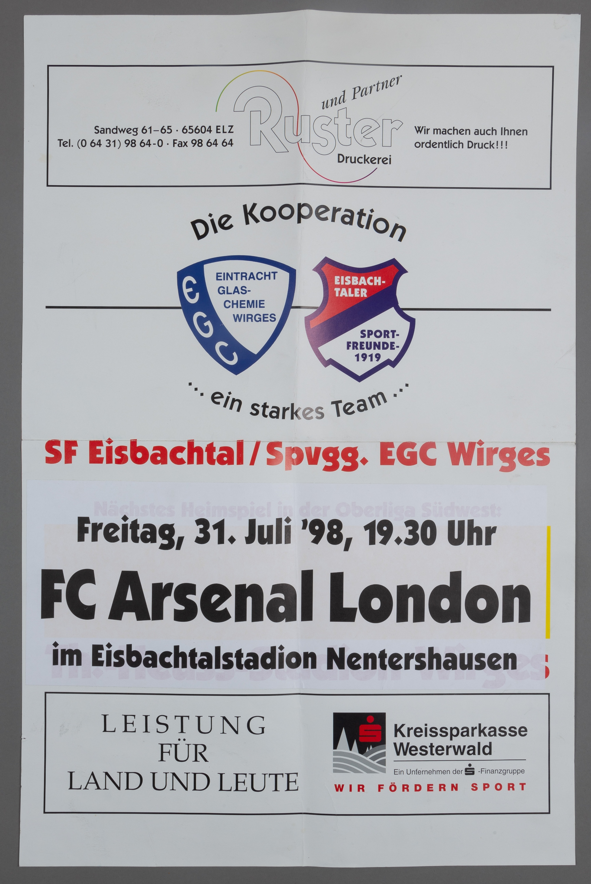 Sportfreunde Eisbachtal v Arsenal pre-season match poster, played at Eisbachtalstadion Nentershausen, 31st July 1998, white poster printed in with text in German, 70 by 46cm., bears horizontal and vertical folds Arsenal defeated Sportfreunde Eisbachtal 4-0.