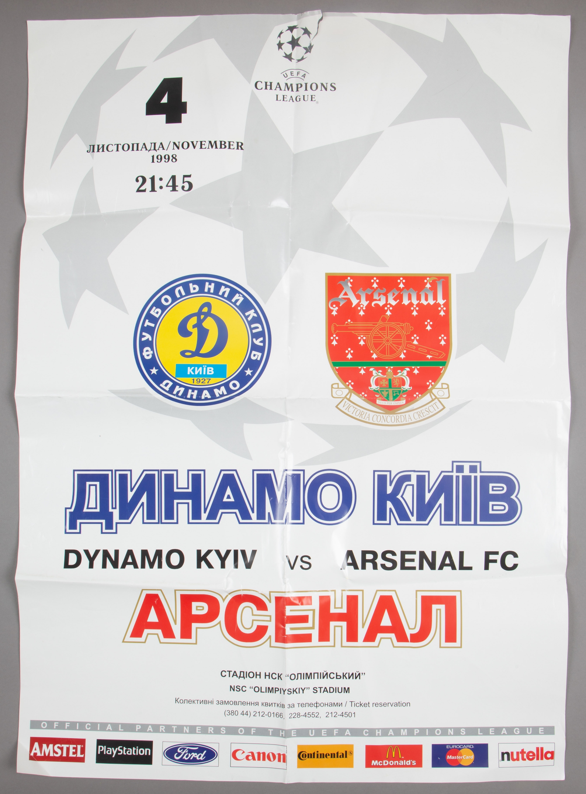 Arsenal v Dynamo Kyiv UEFA Champions League match poster, at Olimpiyskiy Stadium, 4th November 1998, white poster printed with club crests and match details, 83 by 59cm., bears tear to upper margin edge, horizontal and vertical folds, creases Dynamo Kyiv defeated Arsenal 3-1 in this UEFA Champions League Group E fixture.