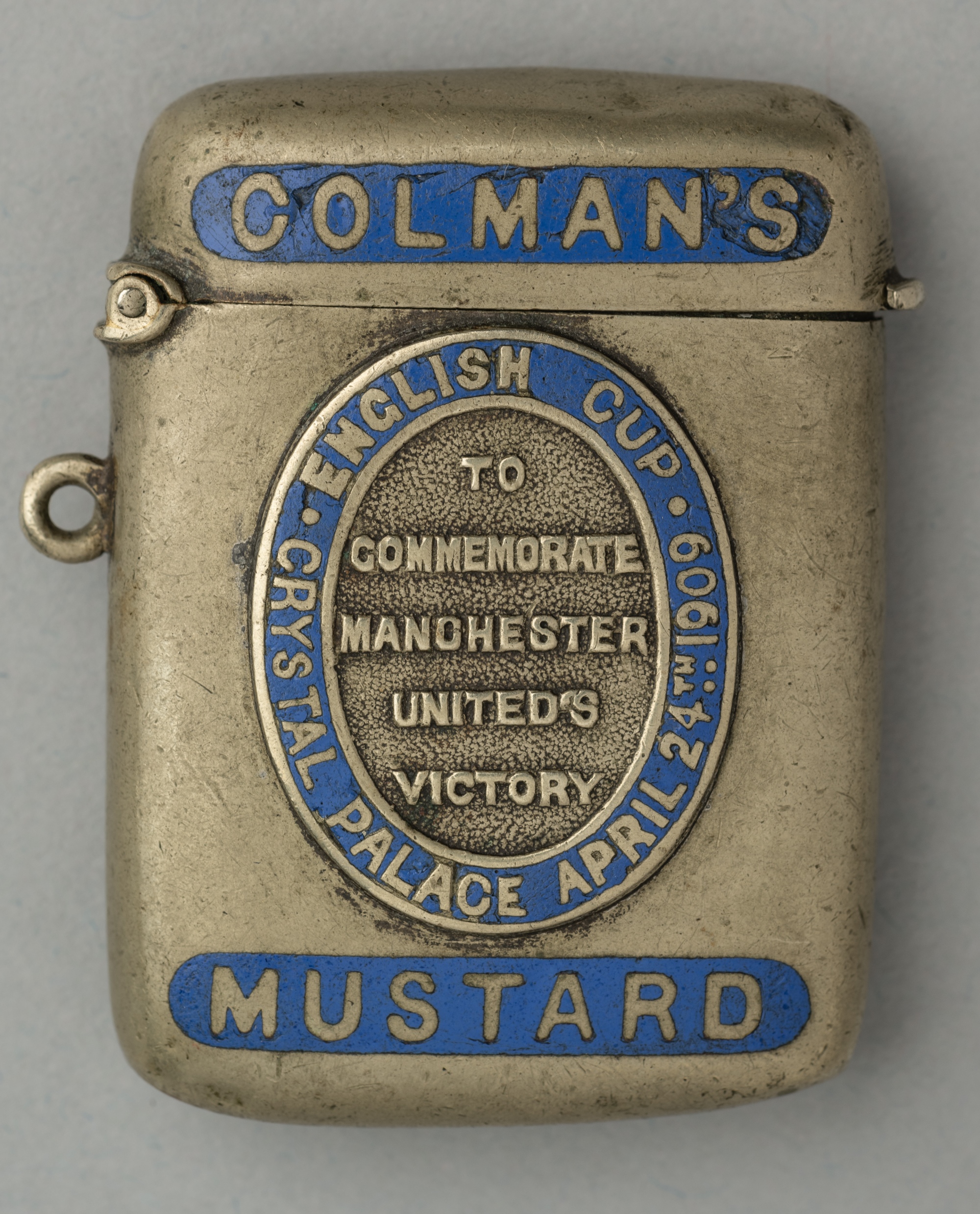 Colmans Mustard Vesta case commemorating Manchester United's first ever English Cup victory v Bristol City played at Crystal Palace, 24th April 1909, bearing blue enamelled and lettering on the front, hinged lid, 5 by 4cm., bears wear