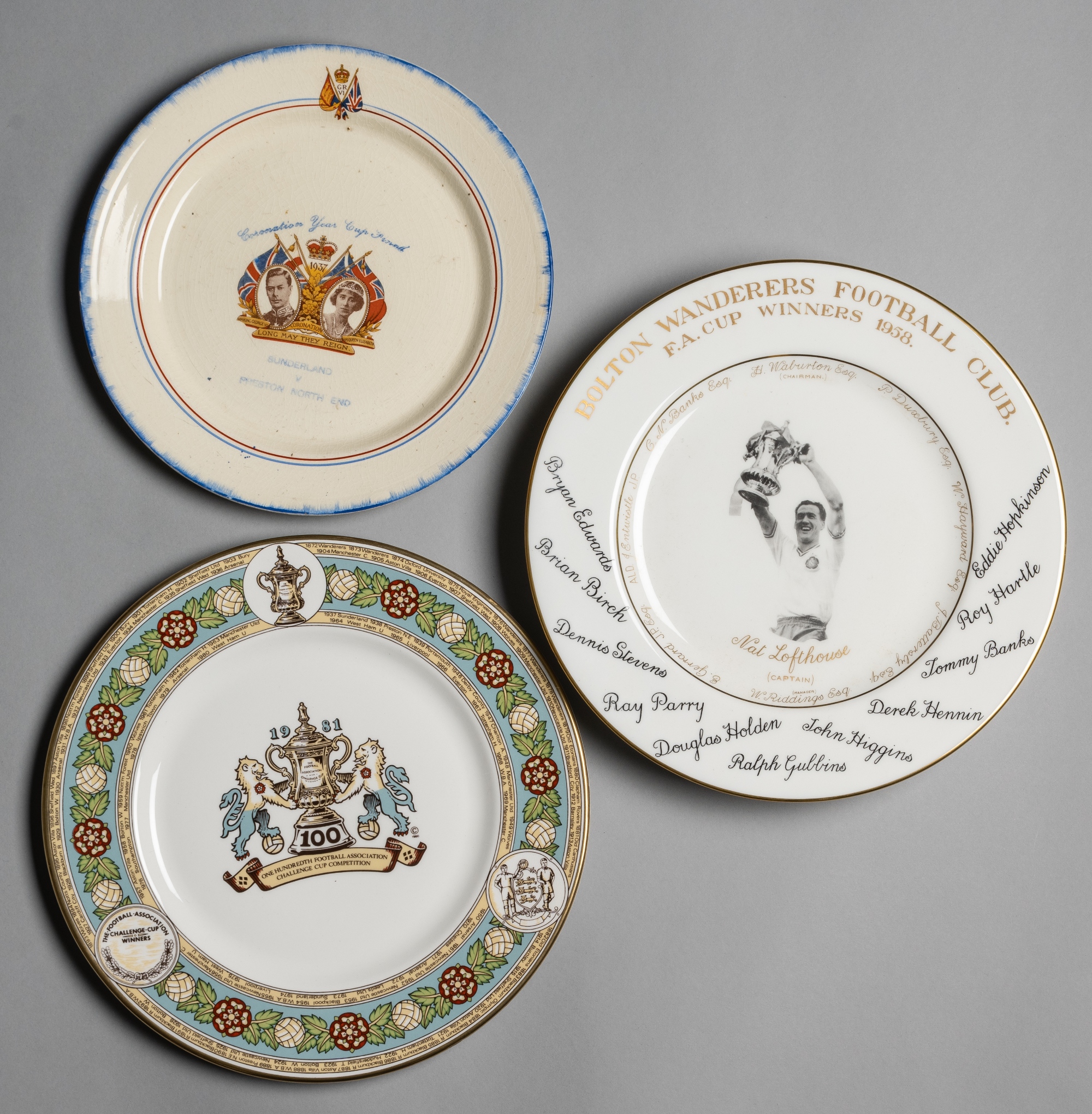 Three F.A. Cup commemorative ceramic plates, comprising Coronation Year Cup Final Sunderland v Preston North End, played at Wembley 1st May 1937 plate featuring images of the King and Queen, diameter 23cm.; cased Crown Staffordshire Bolton Wanderers FC F.A. Cup winner's 1958 commemorative plate, featuring facsimile signatures of the players and central image of Nat Lofthouse, diameter 26cm. cardboard cased, and 100th Football Challenge Cup competition commemorative plate, featuring names of the winners since 1872 flanking a floral border and central trophy motif, diameter 27cm. cardboard cased, (3)