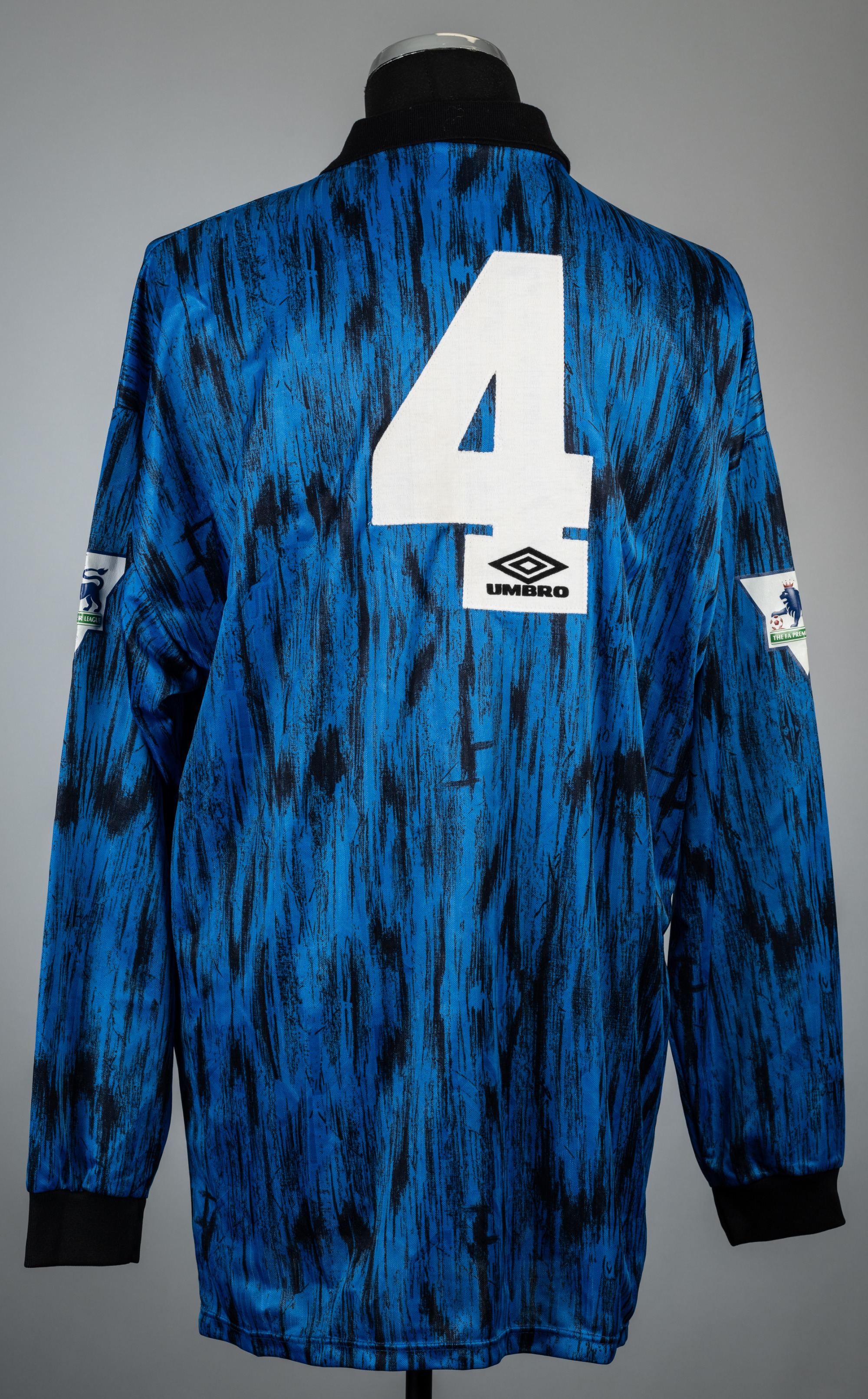 Steve Bruce blue and black Manchester United no.4 away jersey, season 1992-93, Umbro, long-sleeved with THE FA PREMIER LEAGUE sleeve badges, club cre