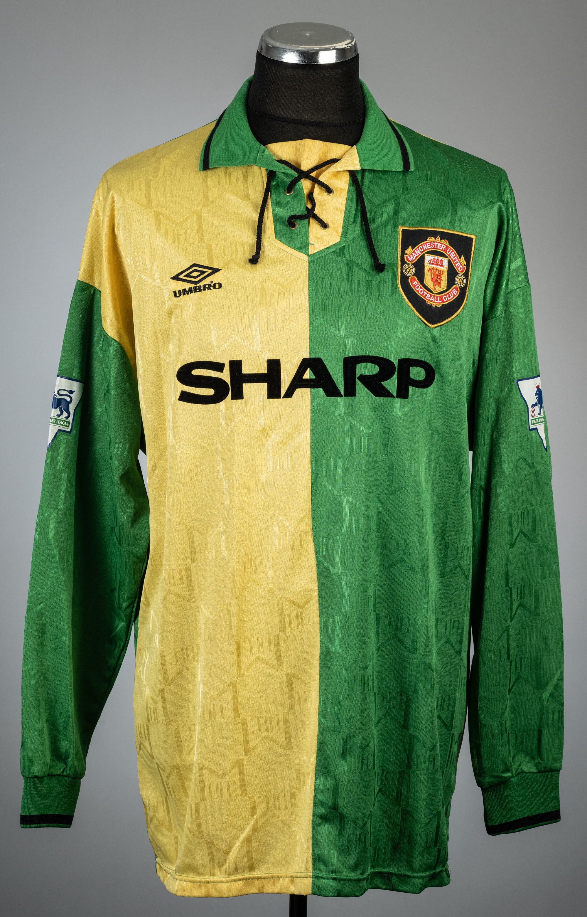 Denis Irwin green and yellow Manchester United no.3 third choice jersey, season 1992-93, Umbro, long-sleeved with THE FA PREMIER LEAGUE sleeve badges, club crest and sponsor logo, with lace neck closure, reverse numbered three, size XL, this jersey is based on style of jersey worn during the Newton Heath period