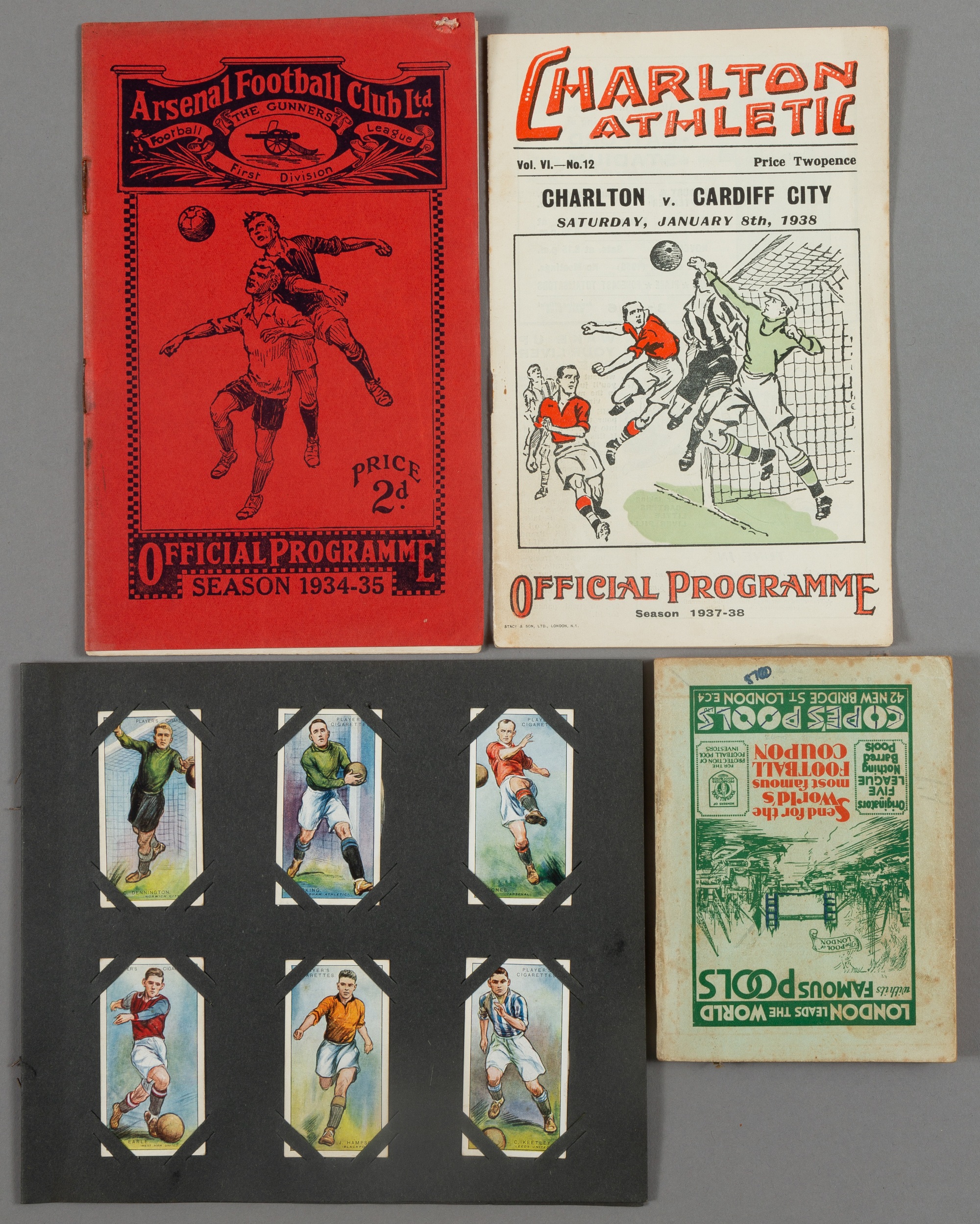 Football Ephemera, including seven Arsenal programmes from the 1930s v Wolves, v Preston (2), Middlesbrough, Huddersfield, Manchester City and Blackpool plus Charlton v Cardiff FA Cup 8th January 1938; together with a full set of 50 John Player footballers cigarette cards 1928; and the second series of 25 cards 1928-29, plus various other footballer cards incomplete, the lot also including a few football annuals from the 1930s, (qty), fair condition with wear to each, annuals poor condition, one with no cover, one with cover in two pieces, programmes fair to good with spines faded and rust marks near staples, cigarette cards fair,