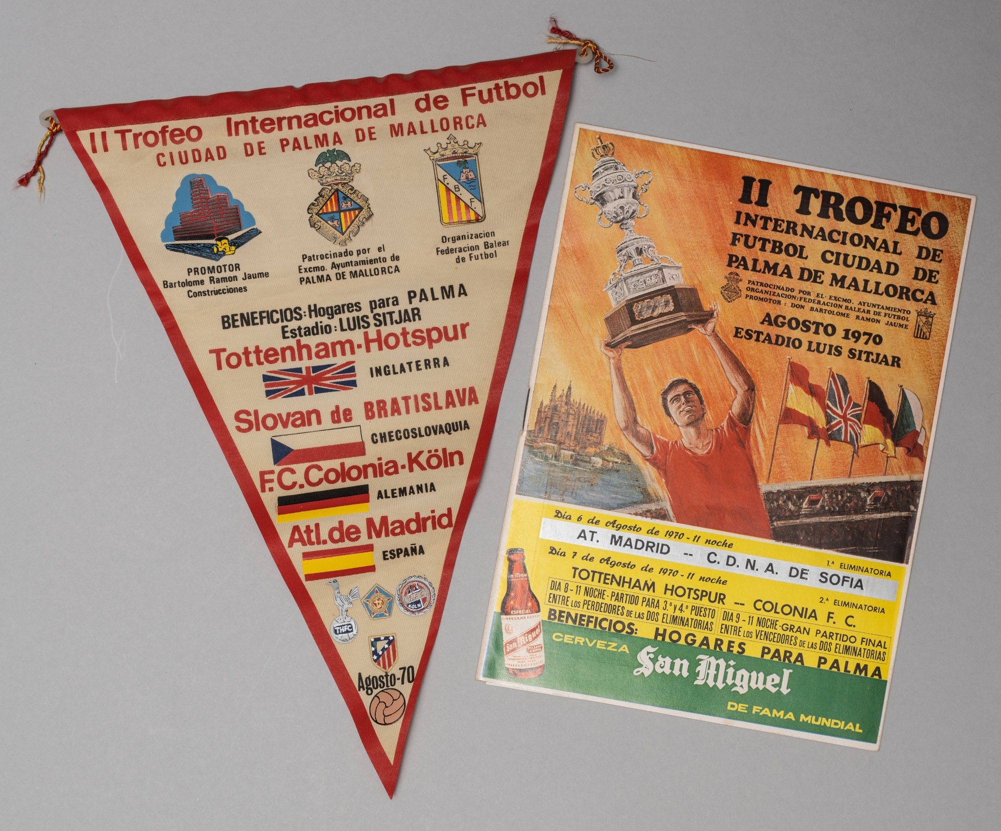 II Trofeo International de Futbol Ciudad de Palma de Mallorca double programme featuring Madrid v Slovan de Bratislava and Tottenham Hotspur v Colonia F.C., 6th & 7th August 1970, 44-page programme with colour illustrated cover, text in Spanish; sold together with a pennant from the tournament listing the four teams in the competition, 27 by 20cm., (2)