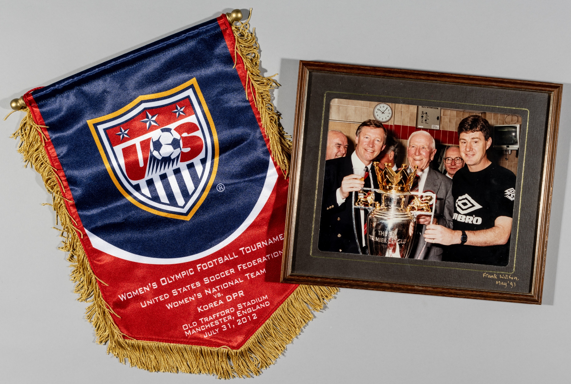 Sir Alex Ferguson, Sir Matt Busby and Denis Irwin colour photograph with the FA Premier League trophy, circa May 1993, mounted, glazed and framed, overall 27.5 by 32.5cm., sold together with a USA Women's London 2012 Olympic Games Football Tournament pennant for the match v Korea DPR played at Old Trafford, 31st July 2012, 39 by 30cm., (2) Provenance: Lester Ellison the Old Trafford dressing room attendant.