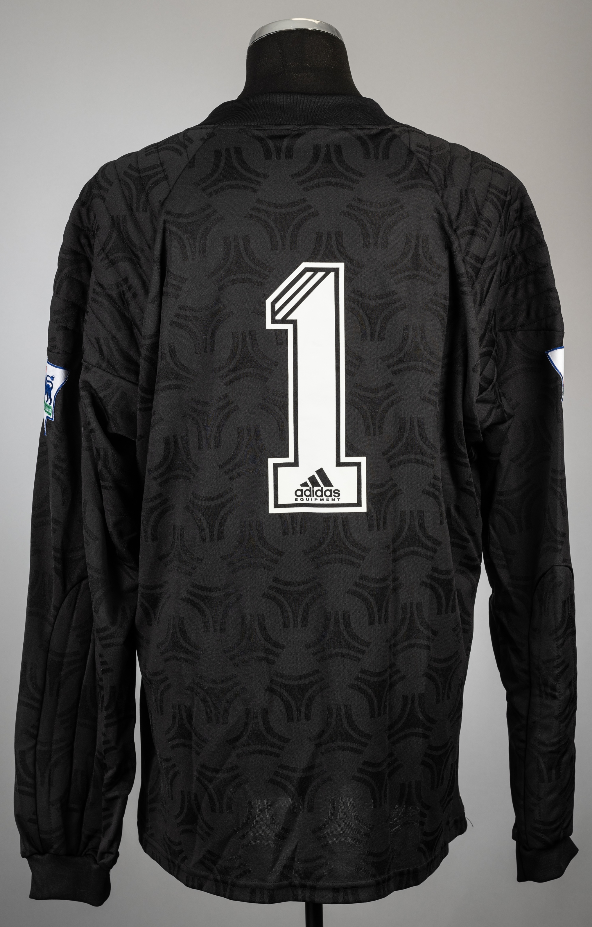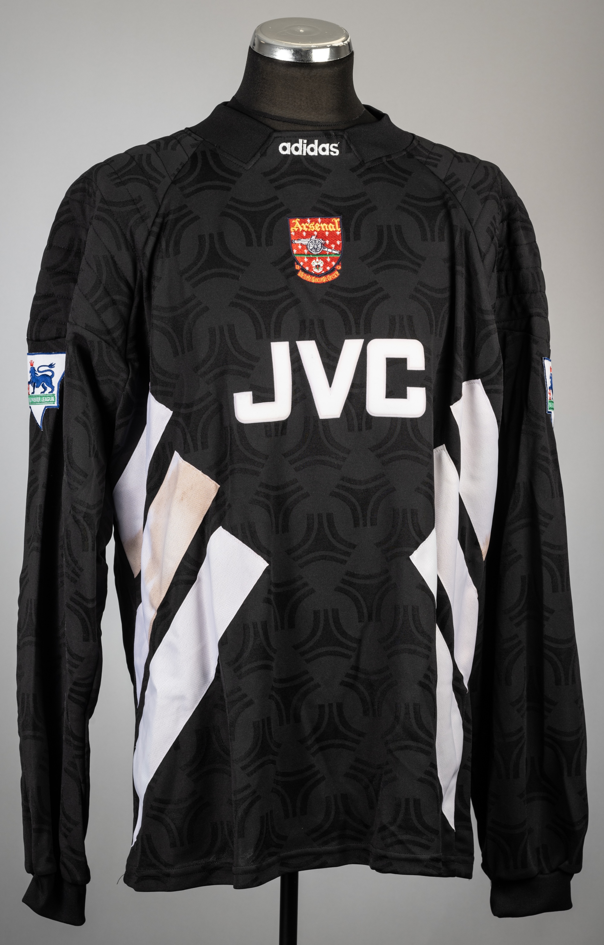 David Seaman black Arsenal no.1 goalkeeper's first jersey, season 1993-94, Adidas, long-sleeved with THE FA PREMIER LEAGUE sleeve badges, club crest and sponsor logo, padded shoulders and elbows, reverse numbered 1, size 48-50in., stains to Adidas stripes on front sides, with red hue in white sponsor logo and white Adidas stripes, possible colour run