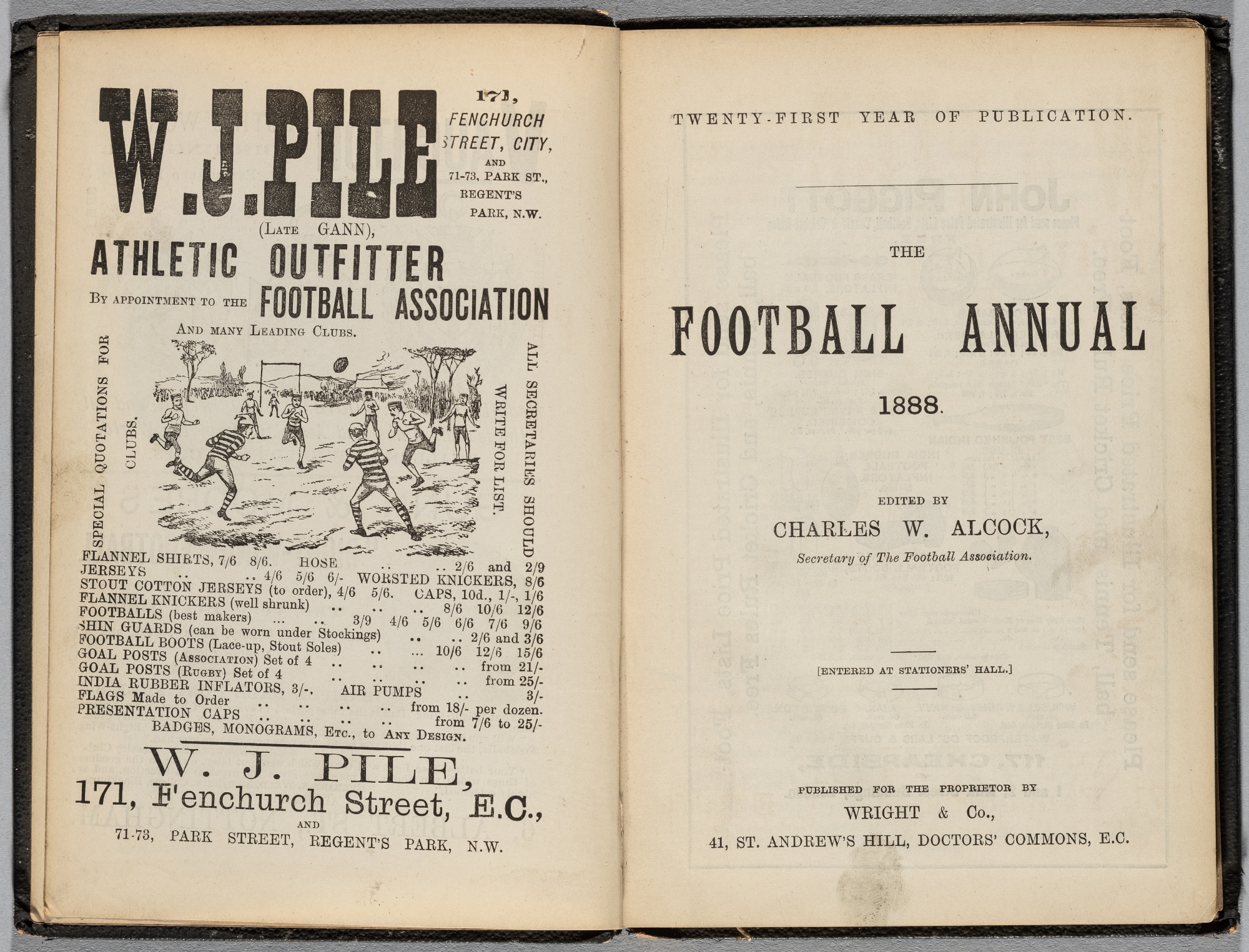 The Football Annual 1888, edited by Charles W. Alcock, published by Wright & Co.,, London, twenty-first edition, 182-pages with hardcover, featuring