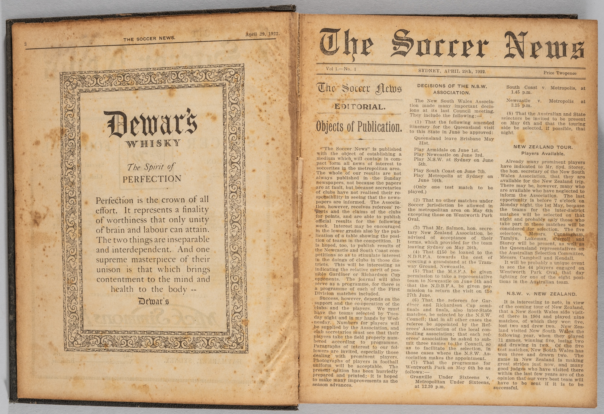 Soccer News Australia 1922-23 bound volume of programmes, consisting of vol.1 no.1 to 21 and vol.2 no.1 to 25, published weekly in Sydney, 46 issues in total. 1922 issues state "A journal devoted to the interest of soccer football, and containing the only authorised lists of names, numbers, colours and positions of players", 1923 issues state "A journal devoted to the interest of soccer, football and containing the only authorised programmes of matches". Included are special editions for Australia's first ever full internationals in New Zealand where they played three test matches against New Zealand in 1922, plus various friendly games on tour v Westland, Wanganui, Wellington and Auckland. Also included are the official soccer news programmes for the following international matches but also includes Australian, League, Cup and various other programmes including New South Wales v Australia 22nd July 1922, Australian FA / Gardiner Cup final Granville v West Wallsend 16th September 1922, Granville FA XI v New Zealand 24th May 1923, New South Wales v New Zealand 28th May 1923, Australia v New Zealand 9th June 1923, Australia v New Zealand 16th June 1923, Granville XI v New Zealand 23rd June 1923, New South Wales v New Zealand 28th May 1923, Australia v New Zealand 30th June 1923, Australia v New Zealand (men's hockey) 11th August 1923, New South Wales v China 18th August 1923, Australia v China 18th August 1923, Australia v China 25th August 1923, Australia v China 15th September 1923, Australia v China 22nd September 1923, Australian FA / Gardiner Cup final Sydney v Wallsend 24th September 1923, Sydney Metropolis v China 26th September 1923, Australia v China 29th September 1923, bears some minor wear to exterior of hardback spine and edge, yellowing of pages and some foxing