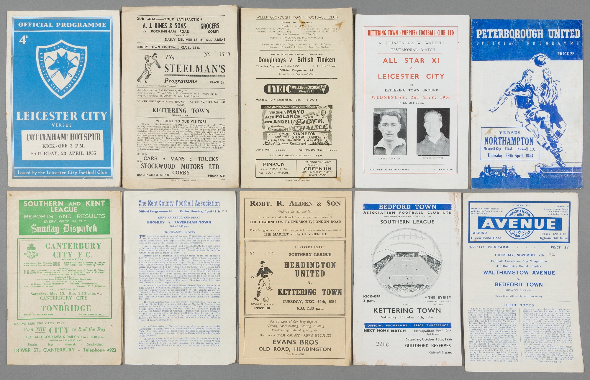 A collection of 1950s football programmes with strong East Midlands interest, including 46 Kettering Town homes dating between 1955 and 1959, Southern League, Central Alliance, Benefit matches, Minor Cups, friendlies; 34 Leicester City dating between 1954 and 1957, League & Cup; plus 5 Rushden, 3 Corby, 3 Wellingborough, 2 Peterborough; the lot also including issues from other English clubs but often (not exclusively) being aways for the aforementioned teams; also non-League content for Bromley FC and Canterbury FC; the lot also including two unusual programmes SW Essen v Alemannia Aachen 4th November 1956, and a French horse racing programmed for Tremblay 1st May 1957, overall in fair condition (qty. approx 150)