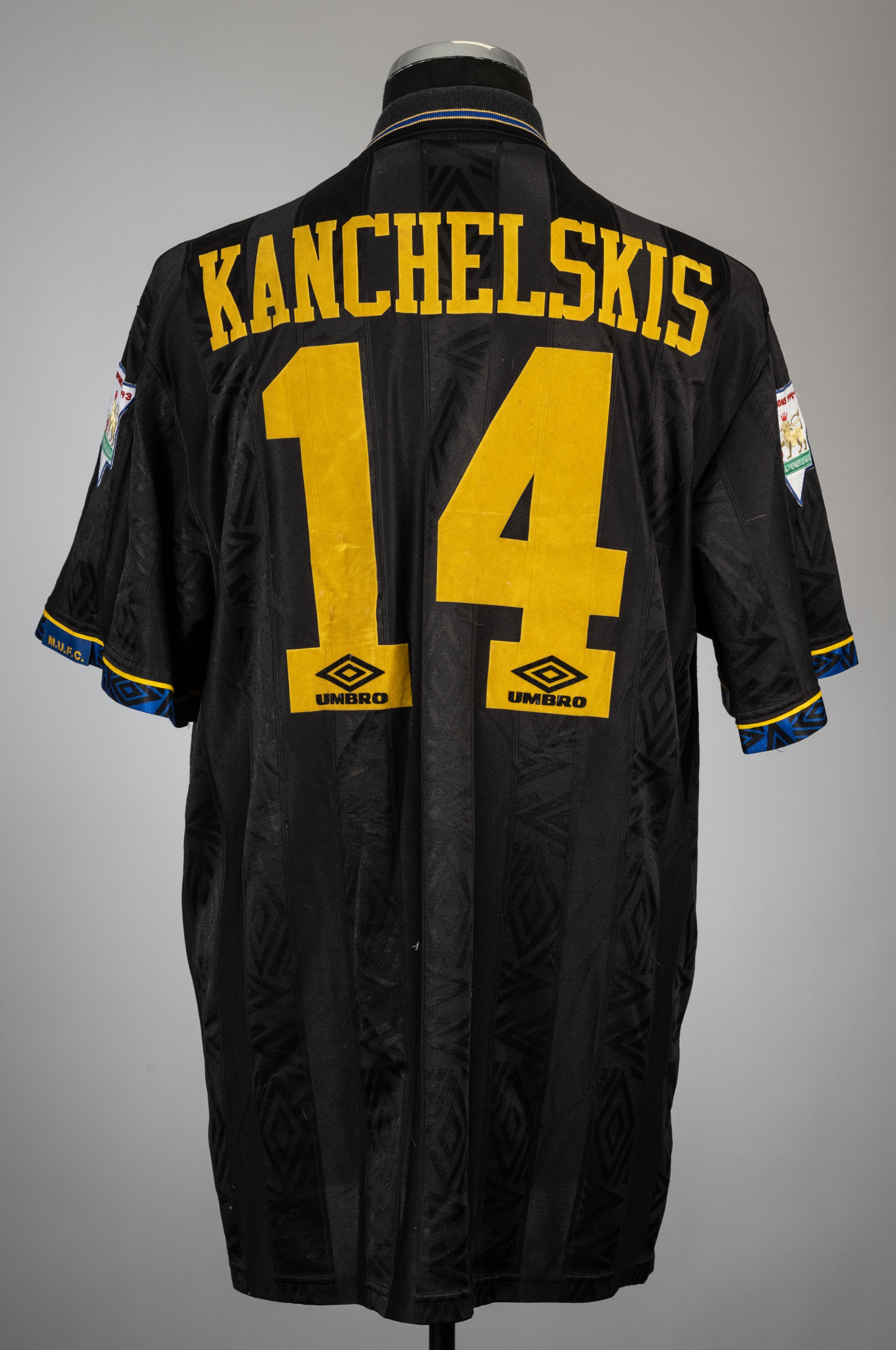 Andrei Kanchelskis black Manchester United no.14 away jersey, season 1993-94, Umbro, short-sleeved with THE FA PREMIER LEAGUE CHAMPIONS 1992-1993 sleeve badges, club crest and sponsor logo, reverse lettered KANCHELSKIS, size XL, neck labels bear 14 and AK in black marker pen