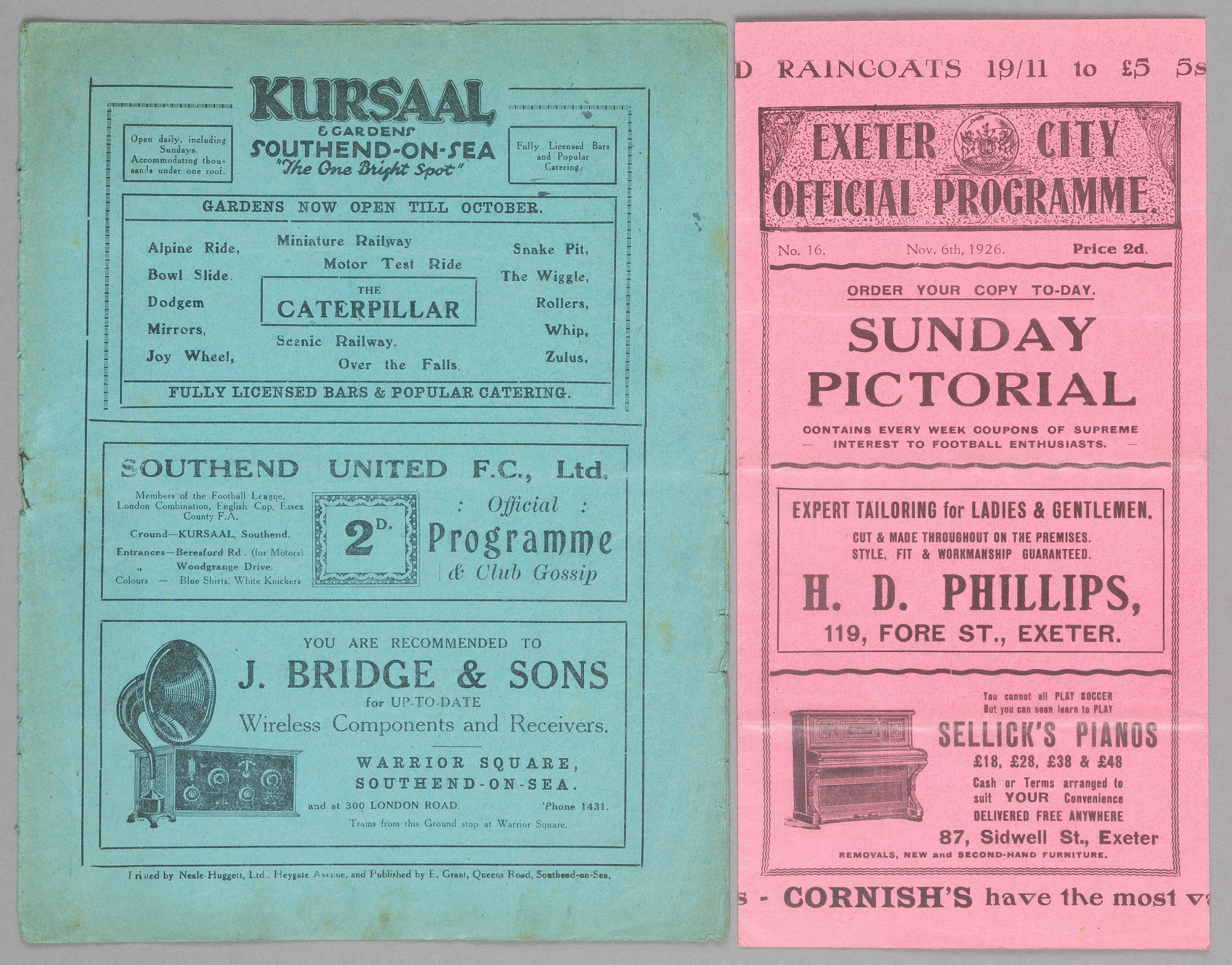 Two Aberdare Athletic away programmes from their final season in the Football League 1926-27, Division Three South fixtures at Southend United 18th September and Exeter City 6th November, (2)