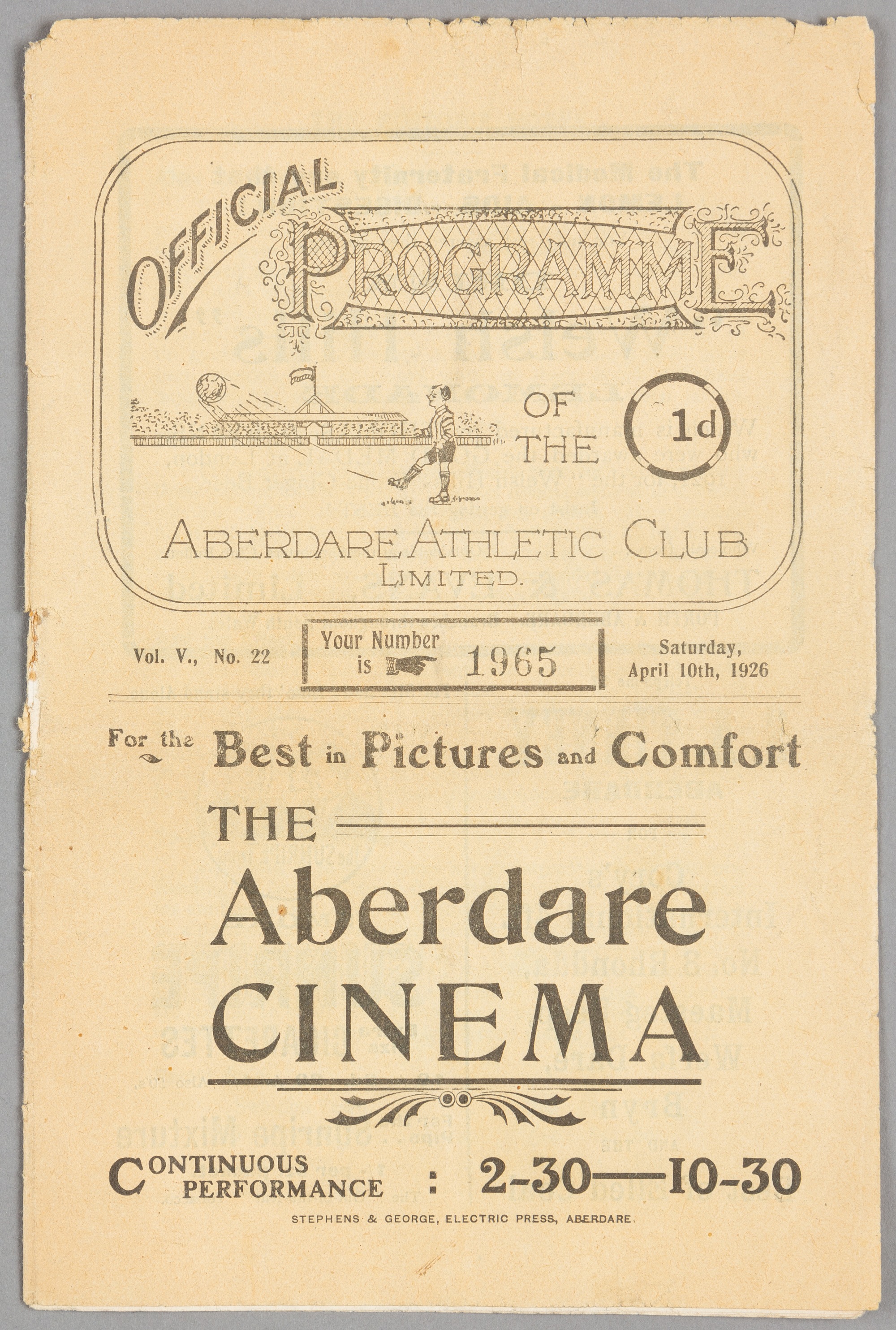 Aberdare Athletic v Reading programme 10th April 1926, F.L. Division Three South fixture, Fragile, faded, wear and paper loss to page edges, some ann